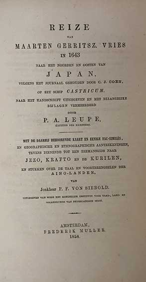 JAPAN -- LEUPE, P.A., uitg. Reize van Maarten Gerritsz. [de] Vries in 1643 naar het Noorden en Oosten van Japan, volgens het journaal gehouden d. C.J. Coen, op het schip Castricum. Met (…) geographische en ethnographische aanteek., tevens dienende tot een zeemansgids naar Jezo, Krafto en de Kurilen, en stukken over de taal en voortbrengselen der Aino-landen v. P.F. v. Siebold. Amst., 1858. (6), 440 pp. W. 1 lge. fold. map and 1 full-p. plate displaying signatures. Ocl. (Bind. carefully restored, and w. or. paste downs, a bit age-toned, but a very good copy).