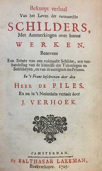 ARTISTS' MANUALS -- PILES, (R.) de. Beredeneerde beschouwing der schilderkunde; en Zamenspraak over de schilderkunde d. L. Dolce (1508-68). In het Nederduitsch vert. d. J. de Jongh. Amst., G. de Groot, 1756. 2 parts in 1 vol. (8), 303, (7); (8), 102 pp. W. engr. front. by J.C. Philips & 2 plates. Cont. mottled cf. w. raised bands & richly dec. gilt back. (Some marg. stains, a bit browned/foxed). -- Id. Beknopt verhaal v.h. leven der vermaardste schilders, met aanmerkingen over hunne werken. Benevens een schets van een volmaakt schilder, een verhandeling v.d. kennisse der tekeningen en schilderyen, en van de nuttigheit der printen. (…) in 't Nederduits vert. d. J. Verhoek. Amst., B. Lakeman, 1725. (30), 531, (4) pp. W. engr. front. Cont. vellum. (Spine dam., hinges weak/broken, loosening, some marg. ink dots, slightly browned). -- (2).