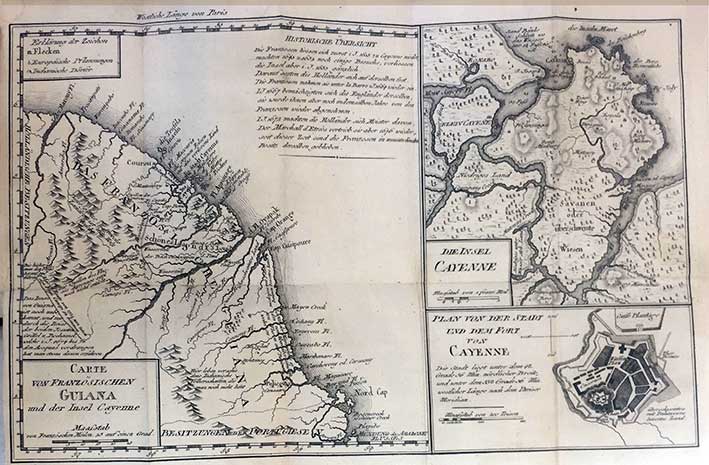 First German edition of an 18th-century account on French Guiana and surroundings with a fine map depicting 3 views: First the map of French Guiana, next the map of the island of Cayenne, and below the plan of the city Cayenne. - Suriname-Cat. UB Amst., 5381; The James Ford Bell Library, P545; Leclerc, 1210; Chadenet, 671. Sabin, 66412 & Van Doorne/Van Kempen, 5381 (both listing the first editions Paris, 1797). "Not an actual voyage, but a mere compilation from other works." (Sabin). - From the library of Willy Lindwer, with his bookplate on endpaper.€ 240