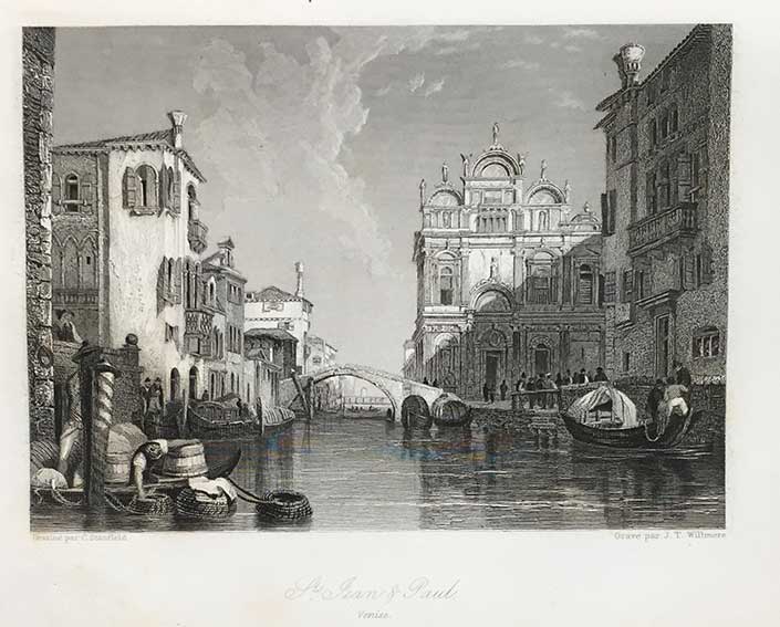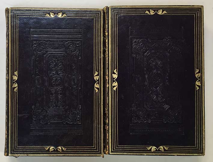 (NISARD, D.). Promenades d'un artiste. Bords du Rhin. Hollande — Belgique. (&) Tyrol — Suisse. Nord de l'Italie. Par., J. Renouard, (1835). 2 vols. (8), 408; (8), 406, (1) pp. W. 2 engr. ti. & 50 engr. plates after Stanfield and Turner. Beautiful blind tooled and gilt dec. blue cf. w. all edges gilt, silk dark blue endpapers. (A bit foxed in places, else a fine set in excellent bindings).