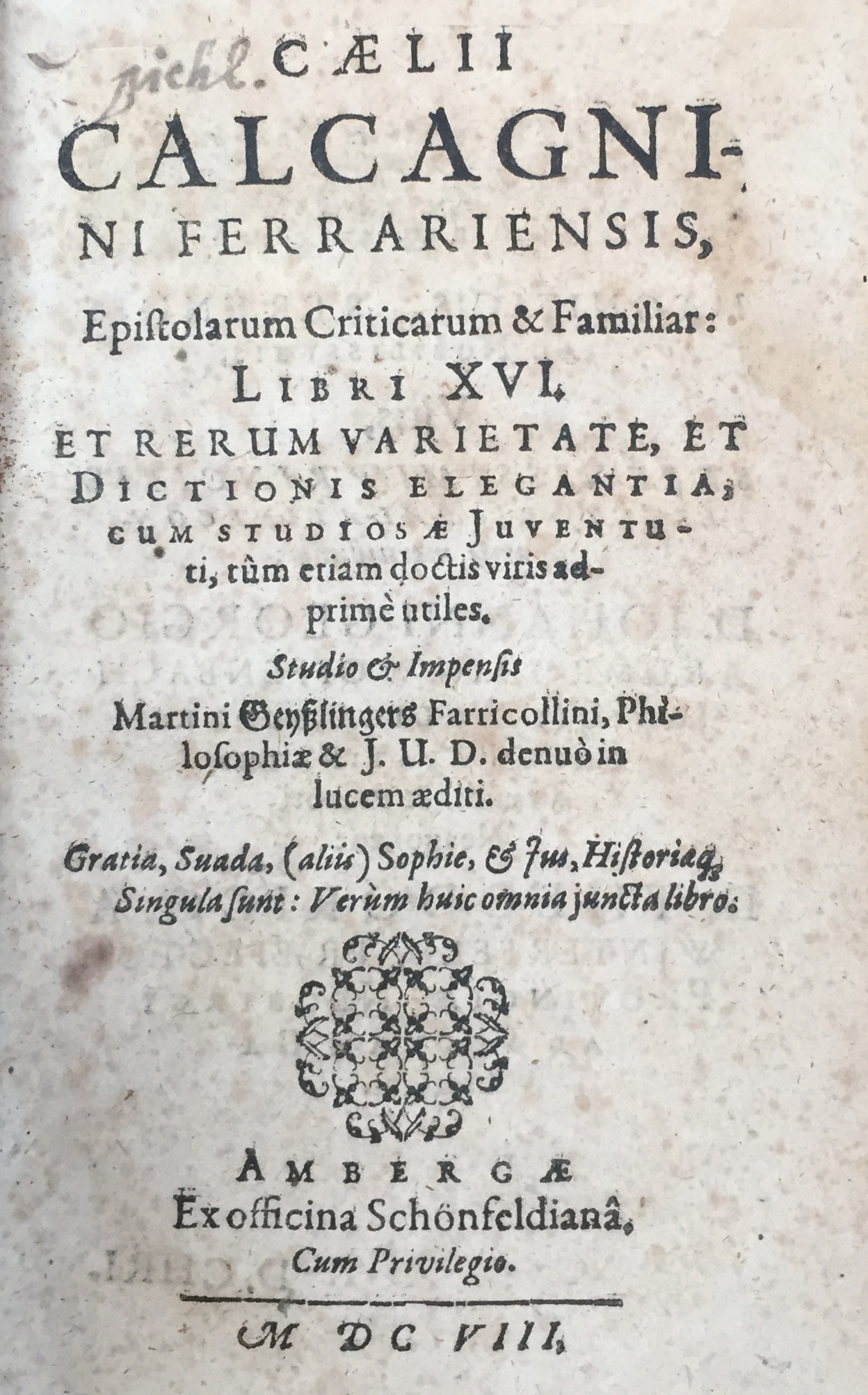 CALCAGNINI, C. Epistolarum criticarum & familiar: Libri XVI. et rerum varietate, et dictionis elegantia, (…). Amberg, Ex Off. Schönfeldiana, 1608. (8), 480 pp. Sm-8°. Cont. cf. w. raised bands, richly dec. gilt back & light brown label. (W. libr. stamp, a bit browned/foxed, outer margin faintly stained at the beginning).