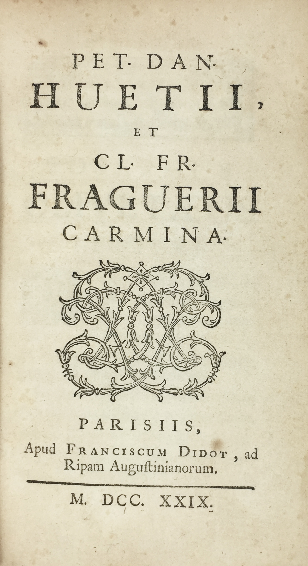 Collected Latin verse of P.D. Huet (1630-1721) and Cl. Fraguier (1660-1728), edited by P.J. Olivet (1682-1768). At the end a Didot stocklist (7 pp.). - Rare. Not in Oberlé.€ 150