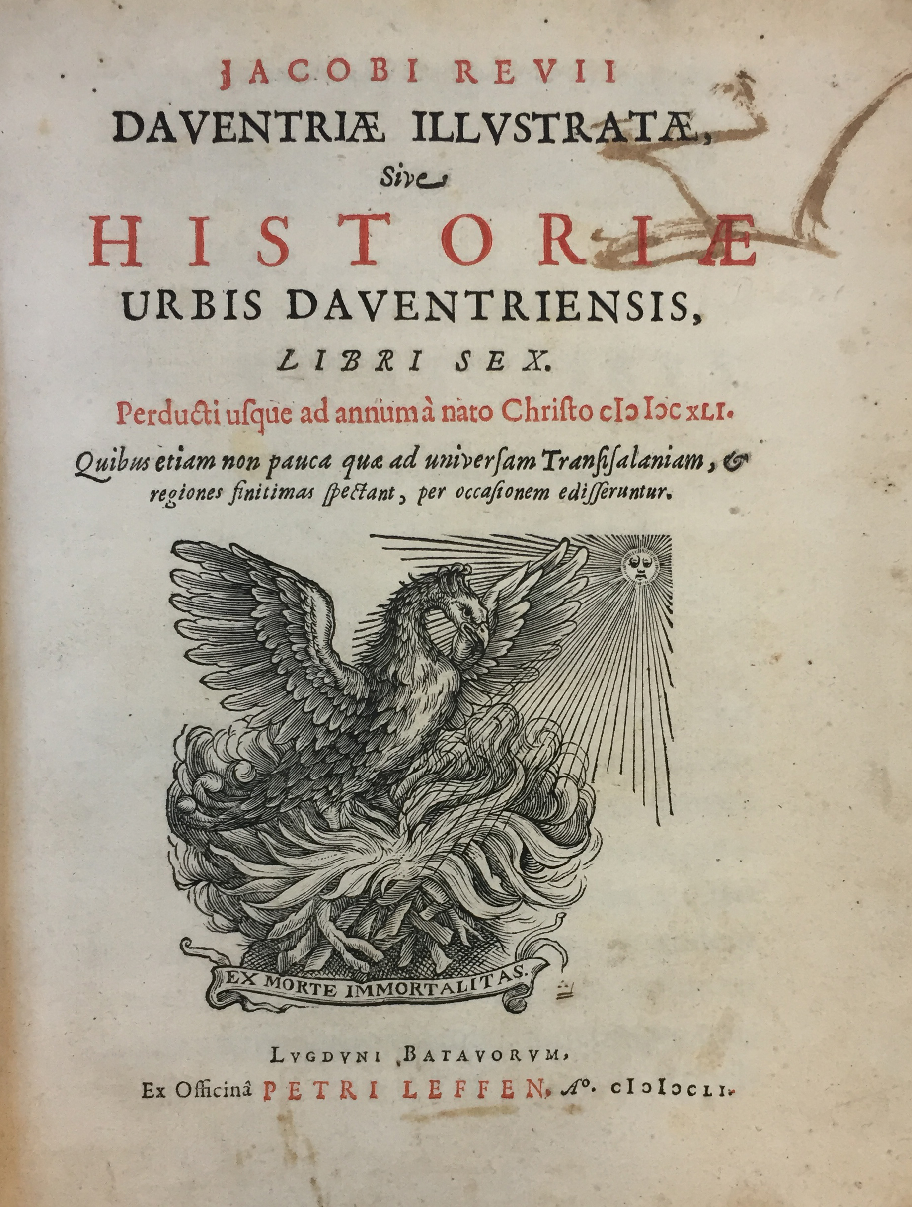 DEVENTER -- REVIUS, J. Daventriae illustratae, sive historiae urbis Daventriensis, ll. VI. Leyden, P. Leffen, 1651. (20), 788 pp. W. ti. printed in red & black, woodcut ti-vign. & a few woodcut ill. 4°. Cont. vellum w. overl. sides. (Ti-p. a bit stained, else good).