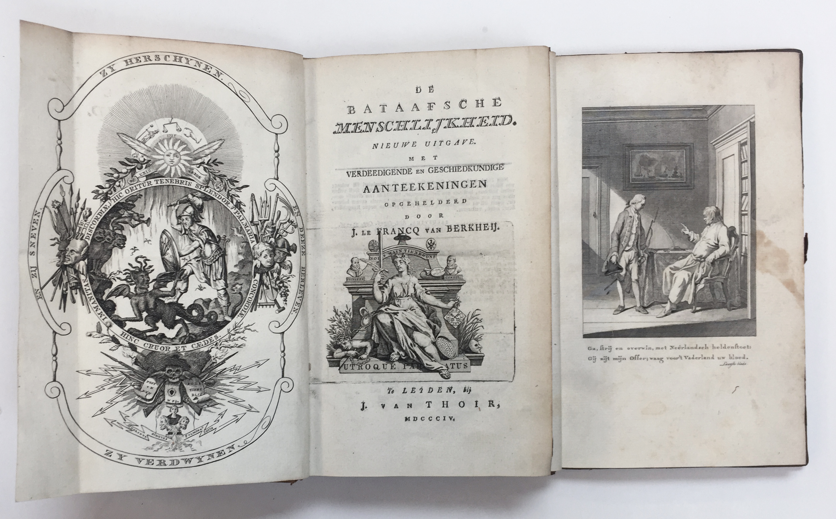FRANCQ v. BERKHEY, J. le. Het verheerlykt Leyden, bij het tweede eeuwgetijde van desz. heuchlijk ontzet, in den Jaare 1574. Leiden, 1774. 40, (8); 95, (5) pp. W. engr. ti., 1 dedic. engr. & 3 engr. portrs. after Houbraken. Cont. cf. w. raised bands, richly dec. gilt back & gilt fillet borders on both sides. (Spine ends slightly chipped, ti-p. a bit foxed). -- Id. De Bataafsche menschlijkheid. Nieuw uitg. Leyden, J. v. Thoir, 1804. xii, 388, (1) pp. W. engr. fold. front. & engr. ti-vign. Cont. hcf. (Spine ends chipped, corners bumped, slightly browned). -- Id. Vaderlyk afscheid en getrouwen raad, van een welmeenend eendrachts-burger, aan zynen zoon; gereed om voor 't vaderland, vryheid en godsdienst, op 's lands vloote van oorloge, te dienen. 2e dr. Amst., J. Allart, 1781. (8), 112 pp. W. engr. front. Cont. hcf. w. red label. -- Added: AFBEELDINGEN v.d. Hoogstraat en Vischbrugge te Leyden. Met de veranderingen, veroorzaekt d. den brand, op den 3. Oct. 1766. 1767. W. 4 fold. plates before and after the disastrous fire by N. v.d. Meer. Cont. hcf. -- (4).