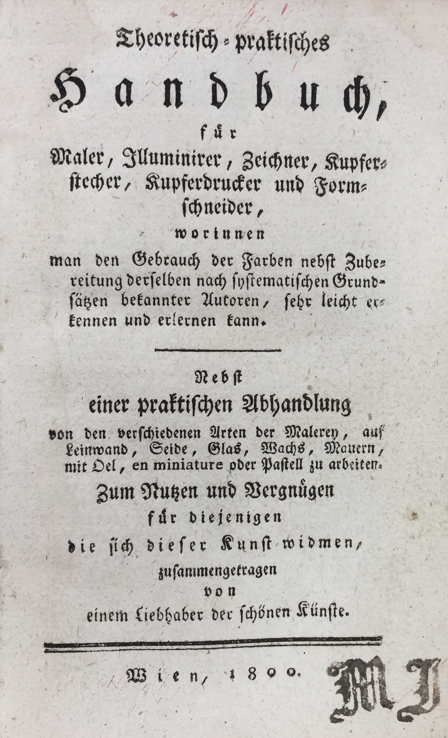 ARTISTS' MANUALS -- MAASKAMP, E. Handleiding voor jonge kunstenaars, in het teekenen van landschappen naar de natuur; Naar de beroemdste Zwitzersche en Engelsche kunstenaars, en uit eigene ondervinding. Amst., E. Maaskamp, 1827. viii, 71 pp. W. fold. front. & 6 full-p. plates: 2 engr. & 4 aquatints, of which 1 cold. by hand. Cont. brds. w. ti-label on front side. (Spine clumsily rep. w. piece of cloth, upper hinge weak, name entry on ti-p.). -- Added: (T. QUERFURT). Theoretisch-praktisches Handbuch, für Maler, Illuminirer, Zeichner, Kupferstecher, Kupferdrucker und Formschneider, (…). Vienna, 1800. 122, (6) pp. Cont. hcf. extra. (Spine ends chipped, stamp on ti.). -- (2).