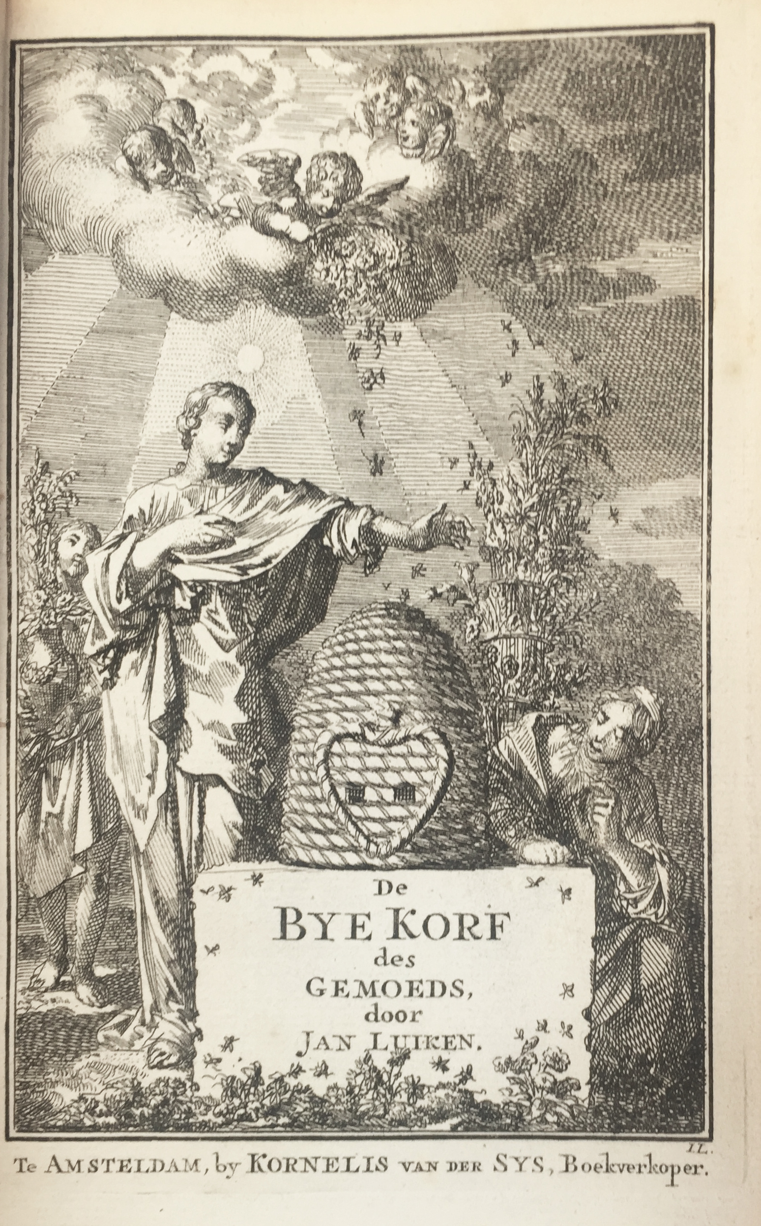 EMBLEM BOOKS -- LUIKEN, J. Beschouwing der wereld. Amst., Erven v. F. Houttuyn, 1778. (6), 406, (2) pp. W. engr. front. & 100 text-engr. by J. & C. Luiken. Sm-8°. Cont. hcf. w. dec. gilt back & black label. (Upper joint split at the ends). -- Id. De bykorf des gemoeds, Honing zaamelende uit alerly Bloemen. Amst., K. v.d. Sys, 1735. (8), 404, (2) pp. W. engr. ti. & 101 fine emblems by J. Luiken in the text. Sm-8°. Cont. vellum. -- (2).