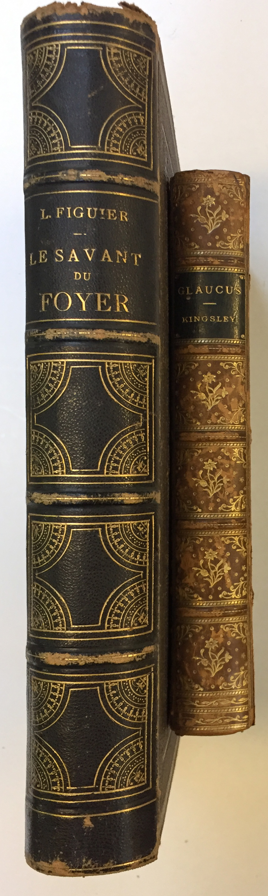 WEISE, G. Gustav Weise's Naturgeschichte in Bildern. Das Pflanzen- und Mineralreich. Tl. 1. Stuttg., (1893). 1 of 2 vols. W. 12 chromolithogr. plates (incl. title). Fol. Or. clothbacked chromolithogr. brds. (Upper hinge strengthened). -- Added: Ch. KINGSLEY. Glaucus or the wonders of the shore. Lond., 1899. Cont. tree cf. w. dec. gilt back, gilt dec. borders on both sides, black label & marbled edges. (Weak joints). -- L. FIGUIER. Le savant du foyer ou notions scientifiques sur les objets usuels de la vie. Par., 1862. W. num. ill. Cont. h. mor. w. raised bands, dec. gilt back & all edges gilt. (Top of spine chipped, slightly foxed). -- (3).