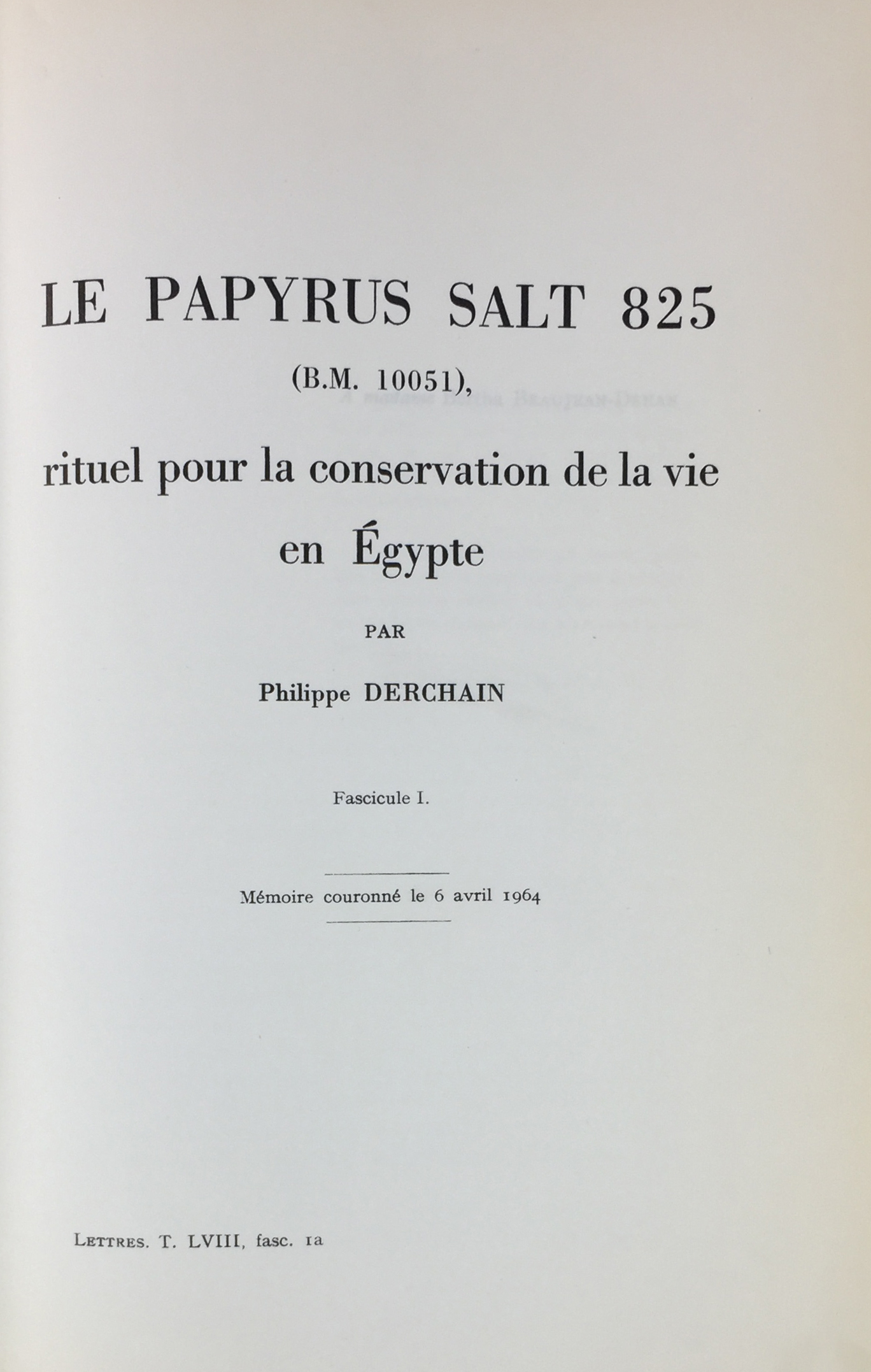 DERCHAIN, Ph. Le Papyrus Salt 825 (B.M. 10051), rituel pour la conservation de la vie en Égypte. Brux., 1965. 3 parts (=2 fasc.) in 1 vol. xiv, 218, (3) pp. W. 25 numb. lvs. w. transcriptions & 16 (fold.) plates. Bound. - Rare.