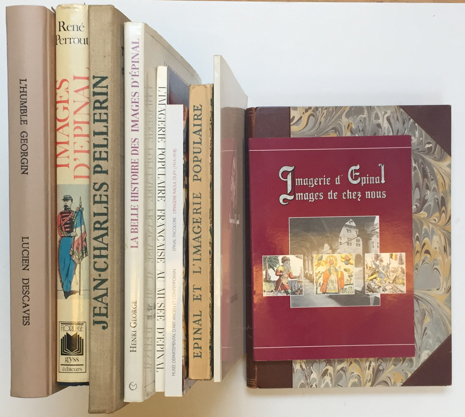 POPULAR PRINTING -- ÉPINAL PRINTS -- PERROUT, R. Les images d'Épinal. Nouv. éd. Par., P. Ollendorf, (c. 1920). W. num. cold. ill. & 5 cold. plates. 4°. Cont. hcf. extra w. owrps. bound up. -- Id. Tresors des images d'Épinal. Nouv. éd. (1985). Prof. ill. 4°. Obrds. w. dust-j. -- L. DESCAVES. L'humbre Georgin, imagier d'Épinal. (1932). Prof. ill. 4°. Cl. w. or. front side laid down. -- J.-M. DUMONT. La vie et l'œuvre de Jean-Charles Pellerin, 1756-1836. (1956). Prof. ill. 4°. Ocl. -- And 6 smaller works. (10).