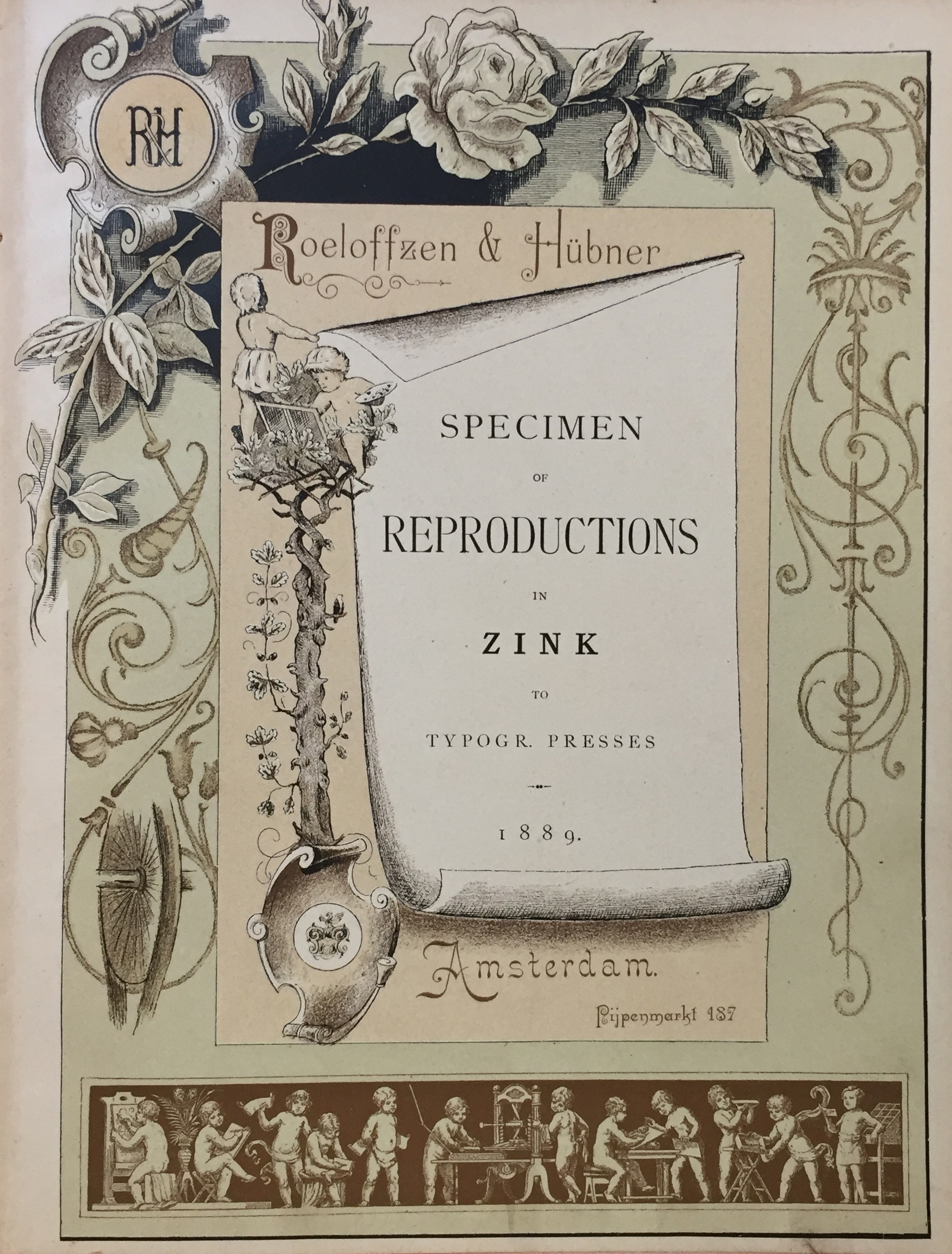 ROELOFFZEN & HÜBNER. Specimen of reproductions in zink to typogr. presses. Amst., 1889. W. lithogr. ti. & 22 reprods. Or. black and gilt dec. red. cl.
