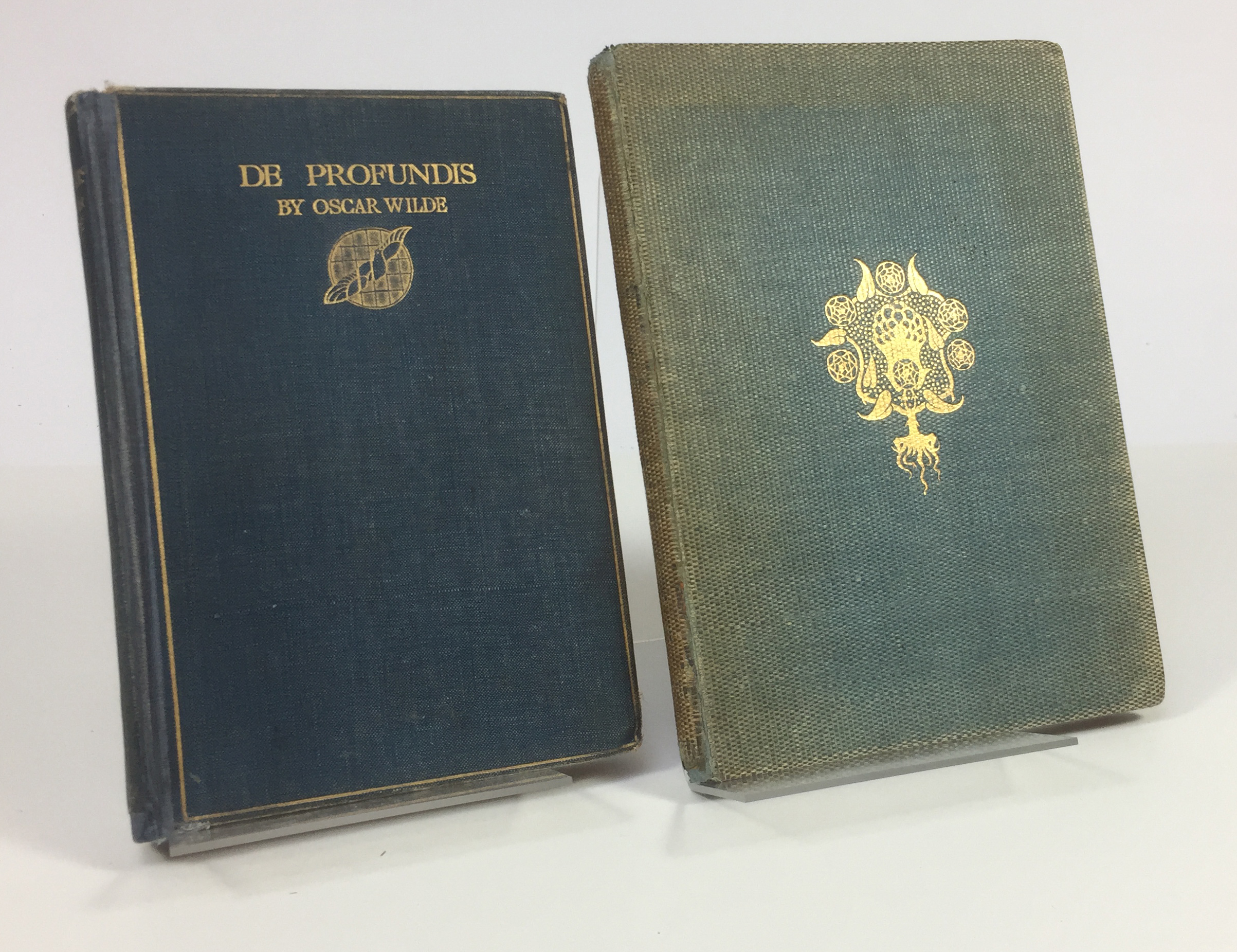WILDE, O. Salome. A Tragedy in One Act: Transl. from the French. Lond./Boston, Elkin Mathews & John Day/Copeland & Day, 1894. W. ti. & 13 plates by A. Beardsley. Or. blue cl. w. gilt dec. centerpieces. (Spine skilfully restored, spine browned, sides a bit browned, name entry on free endpaper). -- Added: Id. De Profundis. Lond., Methuen, (1905). Ocl. (Skilfully rebacked, extremities slightly worn, weak hinges, first and last pages a bit foxing). -- (2).