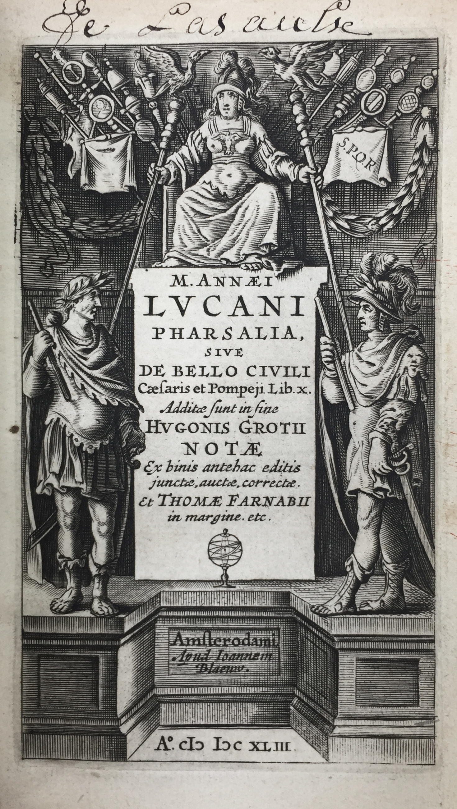 LUCANUS. Pharsalia, sive De Bello Civili Cæsaris et Pompeji ll. X. Add. sunt in fine H. Grotii notæ. Et T. Farnabii in margine. Amst., J. Blaeu, 1643. 330, (6) pp. W. engr. ti. 12°. Cont. vellum w. overl. sides. -- HORATIUS. (Opera). Scholiis sive Annotat., instar Commentarii, Illustratus à J. Bond. Amst., J. Blaeu, 1650. 285, (3) pp. W. engr. ti. 12°. Cont. vellum. -- PLAUTUS. Comoediæ superstites XX. Amst., J. Jansonius, 1630. 692, (1) pp. W. engr. ti. 16°. Cont. vellum w. overl. sides. (A bit browned, stained ar the end). -- (3).
