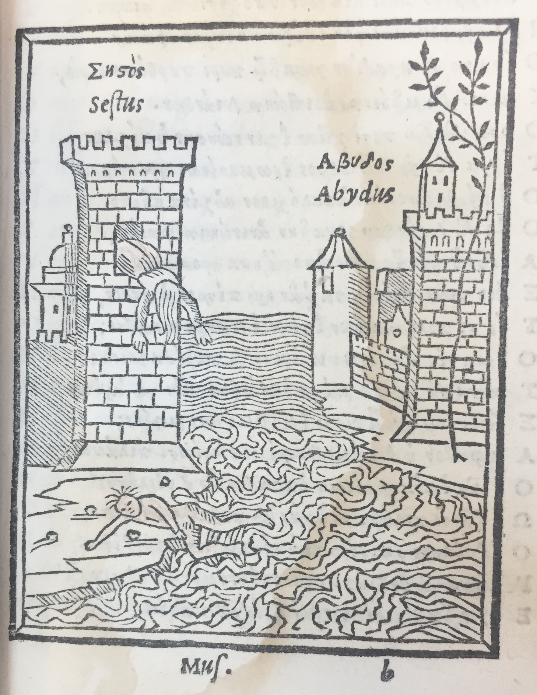 MUSAEUS GRAMMATICUS. Opusculum de Herone & Leandro. [Colophon:] Venice, Heirs of Aldus the Elder, Nov. 1517. 80 lvs. W. Aldine device on ti-p. & final leaf, and 2 woodcut ill. (one w. small pencil annot.). Mod. cf. w. red label. (Some old manuscript notes on ti., small tape rep. to inner margin of a1-c1 and i4-k8, light dampstain throughout).