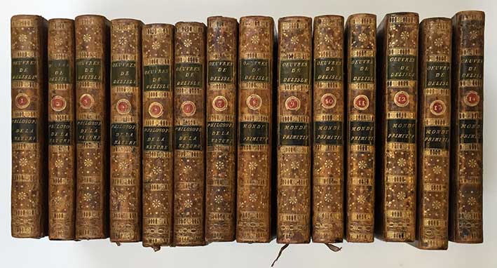 PHILOSOPHY -- (DELISLE DE SALES, J.B.C.). La philosophie de la nature, ou traité de morale pour le genre humain. 5e éd. Lond., 1789. 7 vols. W. engr. front., 1 engr. portr. & 11 engr. plates, all cold. by hand. - Id. Histoire philosophique du monde primitif. 4e éd. Par., Gay et Gide, 1795. 7 vols. W. tog. 30 engr. plates, of which 1 portr. and 20 fold. plates/maps, all cold. by hand. Fine cont. marbled cf. w. richly dec. gilt backs, gilt borders on all sides, inside dentelles, green and black labels, all edges gilt. (A few small defects to binds., a few marg. stains, some minor foxing in a few places, last vol. a bit waterstained).