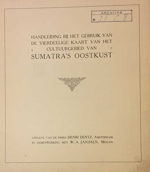 SUMATRA -- DENTZ, H. & W.A. JANSSEN. Cultuurkaarten voor Sumatra's Oostkust (&) Handleiding bij het gebruik van de vierdeelige kaart van het cultuurgebied van Sumatra's Oostkust. Amst., H. Dentz, (1920). 4 fold. cold. maps on linen and booklet (22 pp.). Size 36 x 32 cm. In ocl. slipcase.