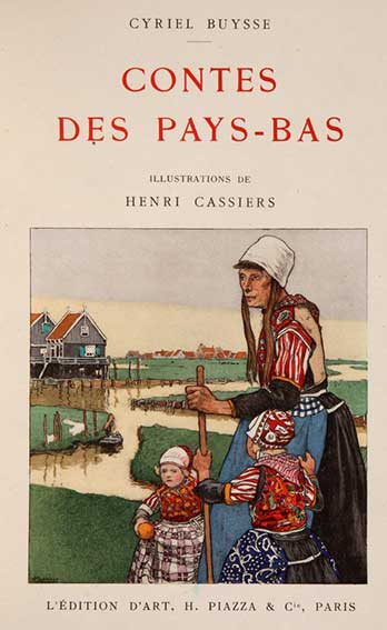 CASSIERS -- BUYSSE, C. Contes des Pays-Bas. Par., H. Piazza, (1910). 159, (6) pp. W. 50 (full-p.) pochoir-cold. ills. by H. Cassiers and an extra suite of the illustrations in b&w. Or. full richly gilt dec. red mor. bind. (by Durvand) w. raised bands, w. orange and brown onlay mor. tulip on spine, burgundy moiré silk doublures, gilt inside dentelles w. onlay orange mor. flower in each corner, owrps. bound up, t.e.g. In or. slipcase. (Top part of slipcase gone, else an excellent copy).