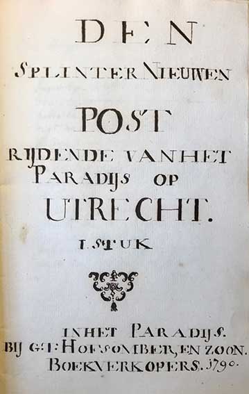 (VUURIG, Bartholomeus). Den splinternieuwen Post, rijdende van het Paradijs op Utrecht. 1. Stuk. In het Paradijs, bij G.T. Hofsomber en Zn. Boekverkopers, 1790. Manuscript on laid paper. (22) lvs. W. front. drawing on vellum of the author (on horseback) in colour. 4°. Cont. marbled brds.