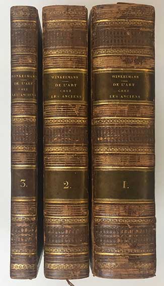 WINCKELMANN, (J.J.). Histoire de l'art chez les anciens. Trad. de l'Allemand; avec des notes hist. et crit. de diff. auteurs. Par., 1794-1803. 2 in 3 vols. W. 3 engr. fronts., 3 ti-vign., sev. head- & tailpieces & 65 engr. plates. 4°. Fine 19th c. richly blind and gilt tooled cf. w. raised bands, inside dentelles & marbled edges. (Upper joint vol. split at the top, slightly foxed/browned in places, but a good set with ample margins).