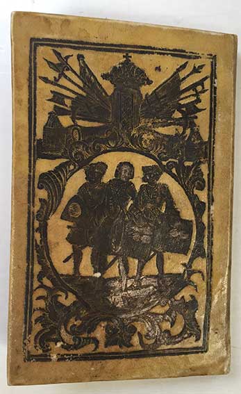 ALMANACS -- ALMANACH, D'ERVEN STICHTERS COMPTOIR, op 't jaar onzes heeren Jesu Christ, 1783. Nevens de maans op en ondergang, d. M. v. Dam. Amst., Erfgen. v.d. Wed. C. Stichter, (1782). (48) pp. Printed in red & black, w. woodcut on ti. & 12 half-p. woodcuts to the months. - Bound with: Schutters Wachtalmanach. Amst., Erfgen. Wed. C. Stichter, (1782). (16) pp. - 2 in 1 vol. Sm-8°. Cont. black tooled vellum w. coat of arms of Amsterdam on front side & three tambours on the back side. (Bind. a bit warped, hinges (partly) broken).