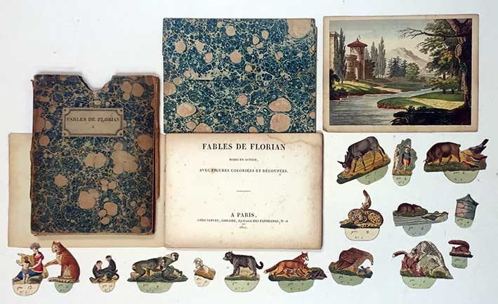 GAMES/TOYS -- ALPHABETISCH MYRIORAMA, bestaande uit meer dan 100 voorwerpen, voorgesteld op 24 gekleurde kaarten, waardoor eene ontelbare menigte landschappen kunnen zamengesteld worden. (N.pl., n.pr., n.d., first half 19th c.). 24 handcold. engr. cards, numb. 1 to 24 and lettered A to Z (except Q and X). 12 x 5,7 cm. Loose as issued in or. green brds. box, w. mounted letterpress title-ticket. (Box slightly worn on extremities, title-ticket stained, some cards lightly stained/soiled, but a very good set). -- Added: FABLES DE FLORIAN mises en action, avec figures coloriées et découpées. Par., Nepveu, 1821. W. booklet (w. fold. lithogr.), 1 handcold. engr. plate & 16 of 21 handcold. shaped engr. figures, contained in a marbled pouch; all contained in a matching marbled slipcase with a mounted printed label. (Slipcase partly dam. & stained/soiled, 6 figures lack, booklet a bit stained/browned). -- (2).