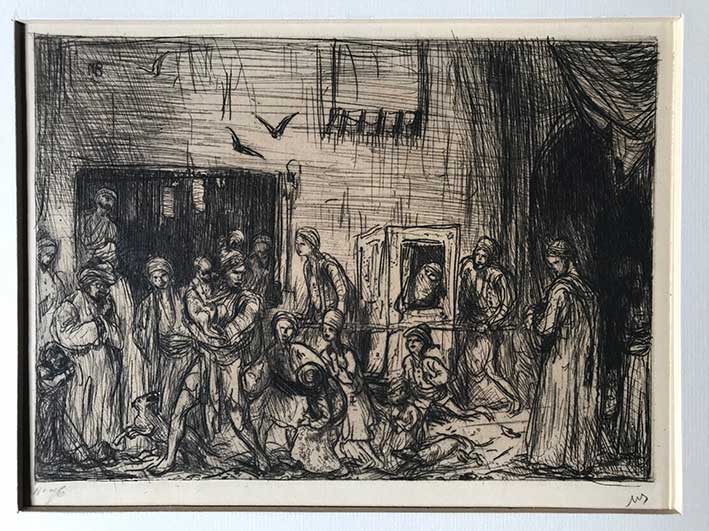 BAUER, Marius Alexander Jacques ('Marius'). (1867-1932).'Een fontein in Stamboel'. N.d. (=1890?). 200 x 150 mm. Etching. Signed in the plate & monogrammed in pencil. Numbered '92' (of 100 copies) in pencil. (Browned on passepartout opening). Wisselingh 77. -- Id. 'Een draagstoel'. N.d. (=1889). Etching. 148 x 197 mm. Monogrammed in pencil. Numbered '76' (of 100 copies) in pencil. (Browned on passepartout opening). Wisselingh 53. -- (2).