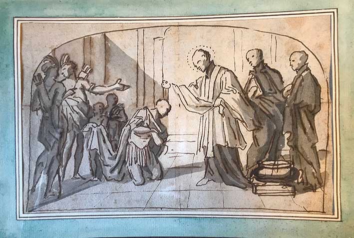 LUYKEN, Jan (1649-1712), attr. Leviticus 8:14: The bull presented for the sin offering, Aaron and his sons laying their hands on its head. N.d. Drawing in ink on paper. 104 x 150 mm. Framed and under glass. (In good condition, but uninspected out of frame). -- Added: Anonymous drawing in ink from the same period of Indians (?) being christianized. 170 x 225 mm. -- (2).
