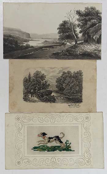 ALBUM AMICORUM for an unknown woman (married) Voorstad (?). The Hague, etc., 1843-69. W. 27 contributions by family and friends on gilt edged laid paper comprising of poems, plain and cold. drawings, embroideries, etc. 12°-obl. Loose in cont. green silk covered album-box w. richly dec. gilt sides & gilt edges. (Front side loose & a bit stained). -- Added: ALBUM AMICORUM for Anna Helena van Rossem ('Lena'). Deventer, 1884-86. W. 16 contributions by family and friends on gilt edged laid paper comprising of poems, plain and cold. drawings, and scraps. 12°-obl. Loose in cont.hcf. album-box w. pictorial front side, sides w. floral dec. & gilt edges. -- (2).