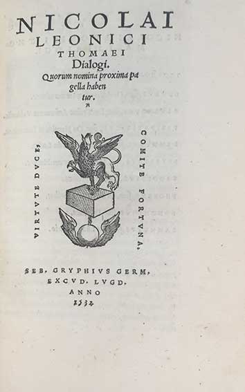 VERGILIUS, POLYDORUS. Dialogorum: De patientia, & eius fructu, libri II; De vita perfecta, lib. I; De veritate & mendacio, lib. I; De prodigiis, lib. III. Basel, M. Isingrinius, 1545. (6), 205 pp. W. woodcut printer's device on the ti. - Bound with: N. LEONICUS THOMAEUS. Dialogi. Quorum nomina proxima pagella habentur. Lyon, Seb. Gryphius, 1532. 267 pp., 2 blank lvs. W. woodcut printer's device on ti. - 2 in 1 vol. Cont. limp vellum w. overl. sides. (A few small holes in vellum, else a nice and clean copy).