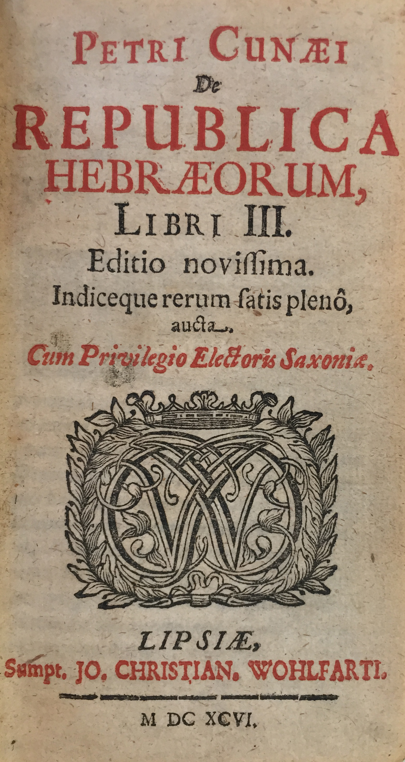 CUNAEUS, P. Orationes argumenti varii: ejusdemque alia Latina opuscula, Satyra Menippea, Juliani Caesares, & Responsum in caussa postliminii (…) C. Cellarius notas & observationes adjecit. Accedunt A. Buchneri Oeconomiae in quinque priores orationes, & A. Vorstii aliorumque laudes funebres. Lpz., M. G. Weidmann, 1735. (14), 614, (26) pp. W. engr. front.-portr. Sm-8°. Cont. vellum. (Rebacked, ti-p. rep., stamp on ti., a bit browned/foxed). -- Id. De republica Hebraeorum ll. III. Ed. nov. Lpz., J.C. Wohlfarht, 1696. (36), 502, (24) pp. W. engr. ti. 12°. Cont. vellum w. overl. sides. (Some underl./annot., a bit browned in places). -- (2).