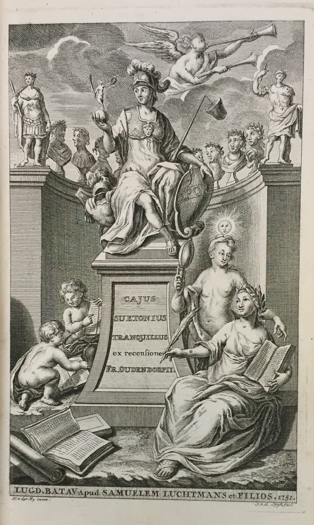 AMSTERDAM -- SUETONIUS. (XII Caesares). Ex rec. F. Oudendorpii, (...) J.G. Graevii, & J. Gronovii, nec non ined. C.A. Dukeri adnot. Leyden, S. Luchtmans, 1751. 2 parts in 1 vol. (40), 1024, (36) pp. W. engr. front., engr. ti.-vign., engr. headpiece (coat of arms) & 12 full-p. portrs. of the emperors. Cont. vellum w. dec. gilt back & gilt coat of arms of Amsterdam on both sides, surrounded by a gilt floral border. (Ties (partly) gone).