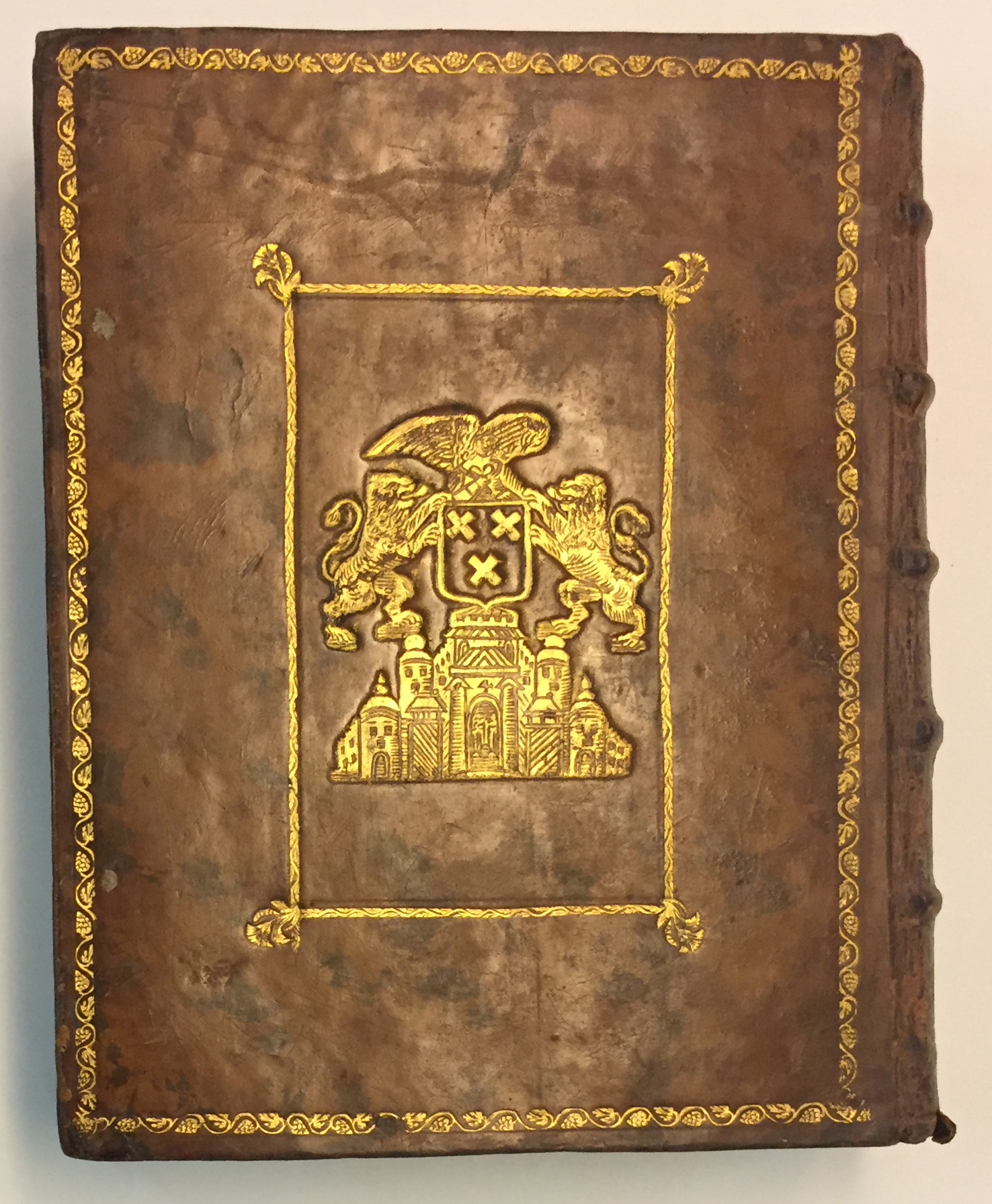 BREDA -- GELLIUS. Noctium Atticarum ll. XX. (...). Novo & multo labore exegerunt, perpet. notis & emend. ill. J. Fredericus & J. Gronovii. Leiden, C. Boutesteyn & J. du Vivié, 1706. (34), 903, (63) pp. W. engr. front. & engr. ti-vign. 4°. Cont. mottled cf, w. raised bands, richly dec. gilt back, gilt coat of arms of Breda on both sides (2 diff. coat of arms!) surrounded by 2 dec. gilt borders, red label, speckled edges. (Spine ends slightly chipped, else a nice copy).