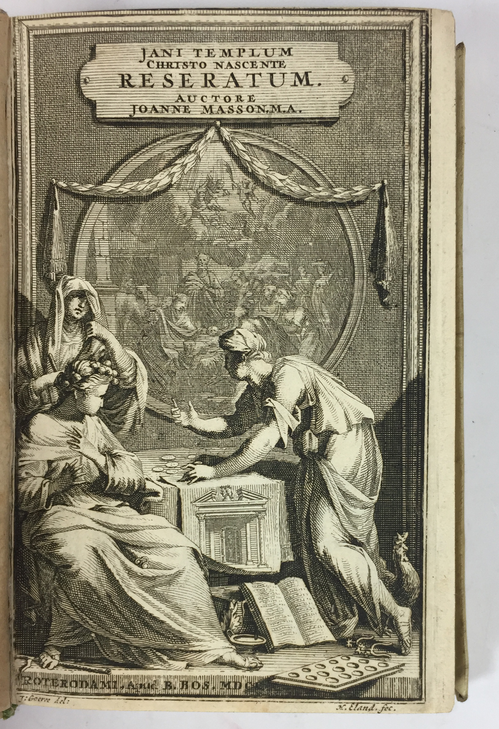 MASSON, J. Jani Templum Christo nascente reseratum, seu Tractatus chronologico-historicus. Rott., B. Bos, 1700. (62), 411, (22) pp. W. finely engr. ti-p. by H. Elandt after J. Goeree and num. numismatical text-engr. Sm-8°. Cont. vellum w. overl. sides & gilt monogram (BFVL) on front side. (Small stamp of M.Fr.W. Noldius on v° ti-p.).