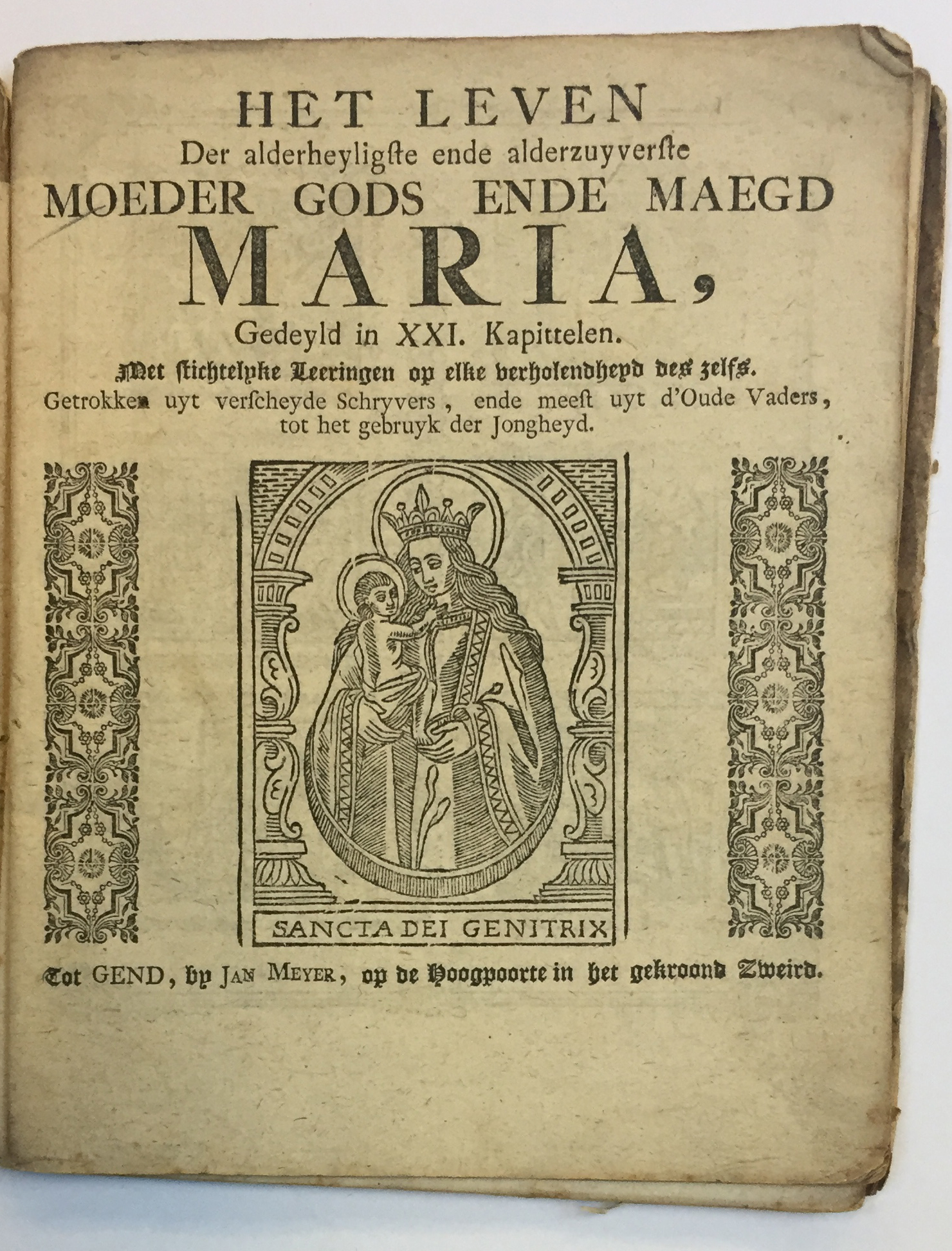 CHAPBOOKS -- HISTORIE van den Ridder van Avonturen Helias, welken genaemd word den Ridder met de Zwaene. Ghent, L. van Paemel, (c. 1820). (72) pp. W. woodcut ill. 12°. Rebound in half vellum w. red label. -- LEVEN, Het, der Alderheyligste ende alderzuyverste moeder Gods ende Maegd Maria. Ghent, J. Meyer, (end 18th c.). 55, (1) pp. W. ti-woodcut. 4°. Old (worn) wrps. (A bit browned/foxed). -- (2).