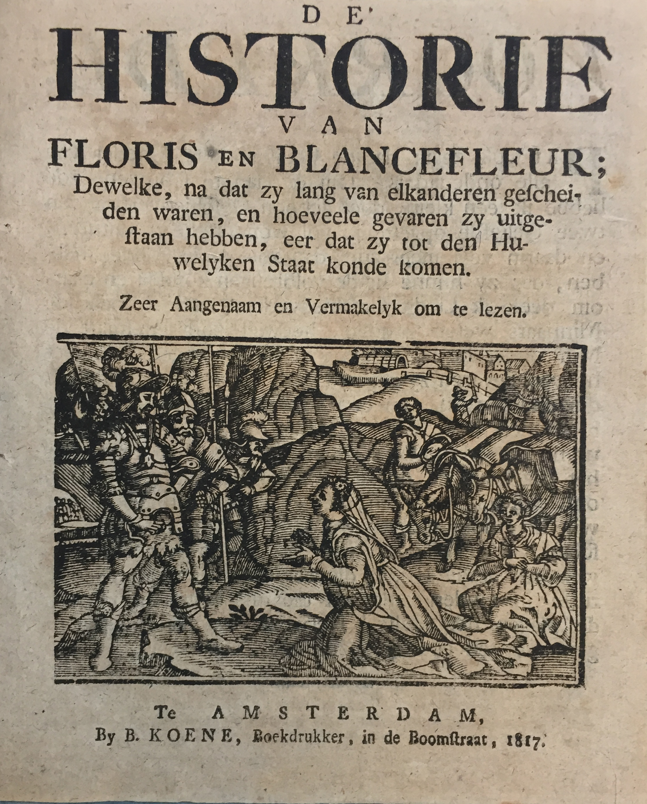 CHAPBOOKS -- SCHOONE HISTORIE, Een, en miraculeuze geschiedenis Van den Ridder met de Zwaan. Die te Nymegen in Gelderland te Scheep kwam, by het geleide van eene Zwaan, uit den Landen Lilefoort, (…) in Vlaanderen. Amst., B. Koene, (c. 1815). (19) lvs. W. small woodcut on ti. and 3 large woodcuts in text. 4°. Limp brds. (Last blank fails). -- HISTORIE, De, van Floris en Blancefleur. Amst., B. Koene, 1817. 24 pp. W. ti-woodcut & 5 text-woodcuts. 4°. Wrps. (Margins cut, a bit browned). -- (2).