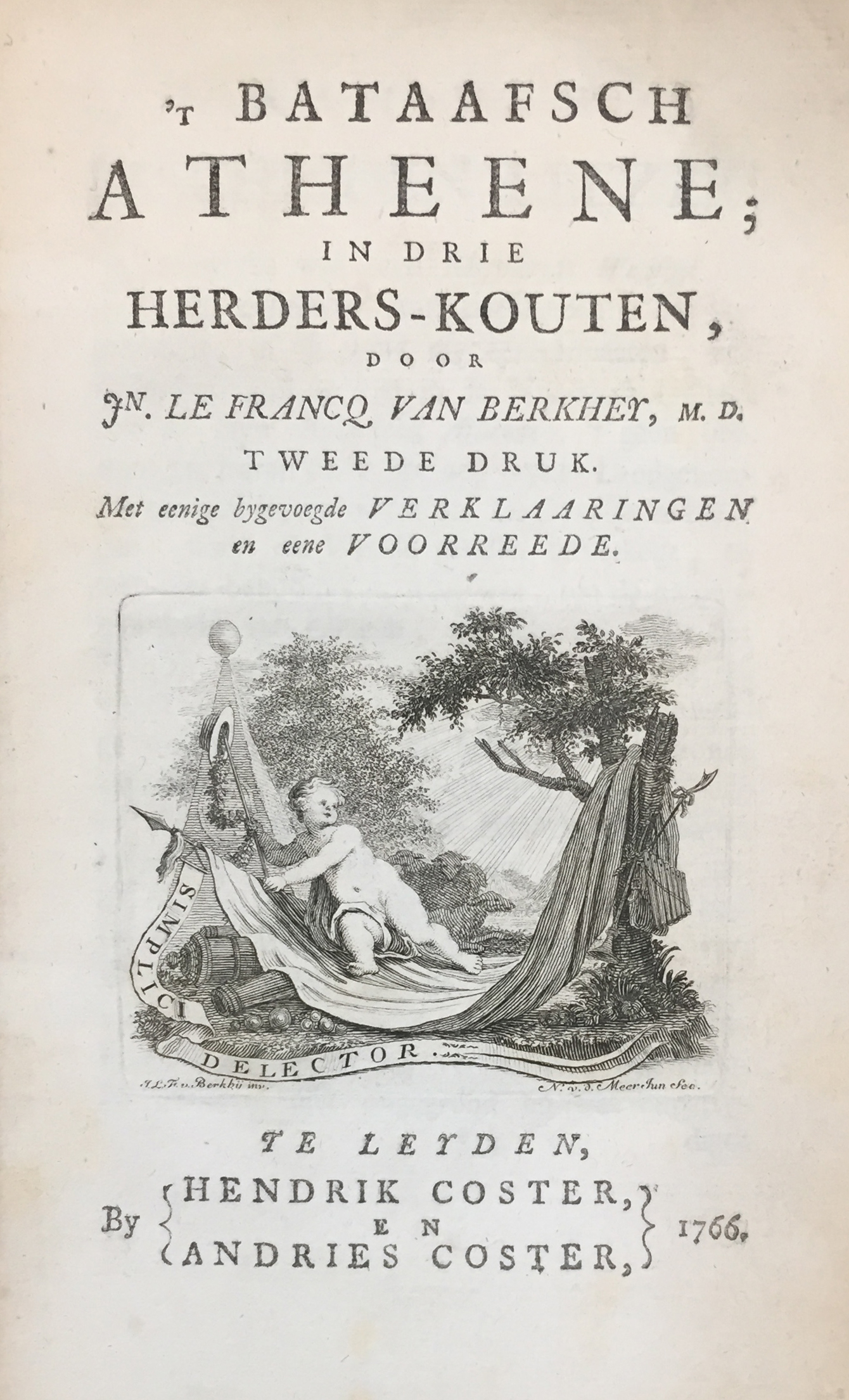 FRANCQ v. BERKHEY, J. le. Eerbare proefkusjes van vaderlandsch naïf, in de arkadische vrijerijen van Dichtlief & Gloorroos. Amst., J. Allart, 1782. xxxvii, (3), 388 pp. W. engr. ti-vign. & 4 full-p. engr. (i.a. a view on 'De Burcht at Leyden') by N. v.d. Meer. Cont. hcf. spine w. gilt floral decoration. (Corners bumped/worn, lower margin faintly stained at the beginning). -- And 1 o. by the same. (2).