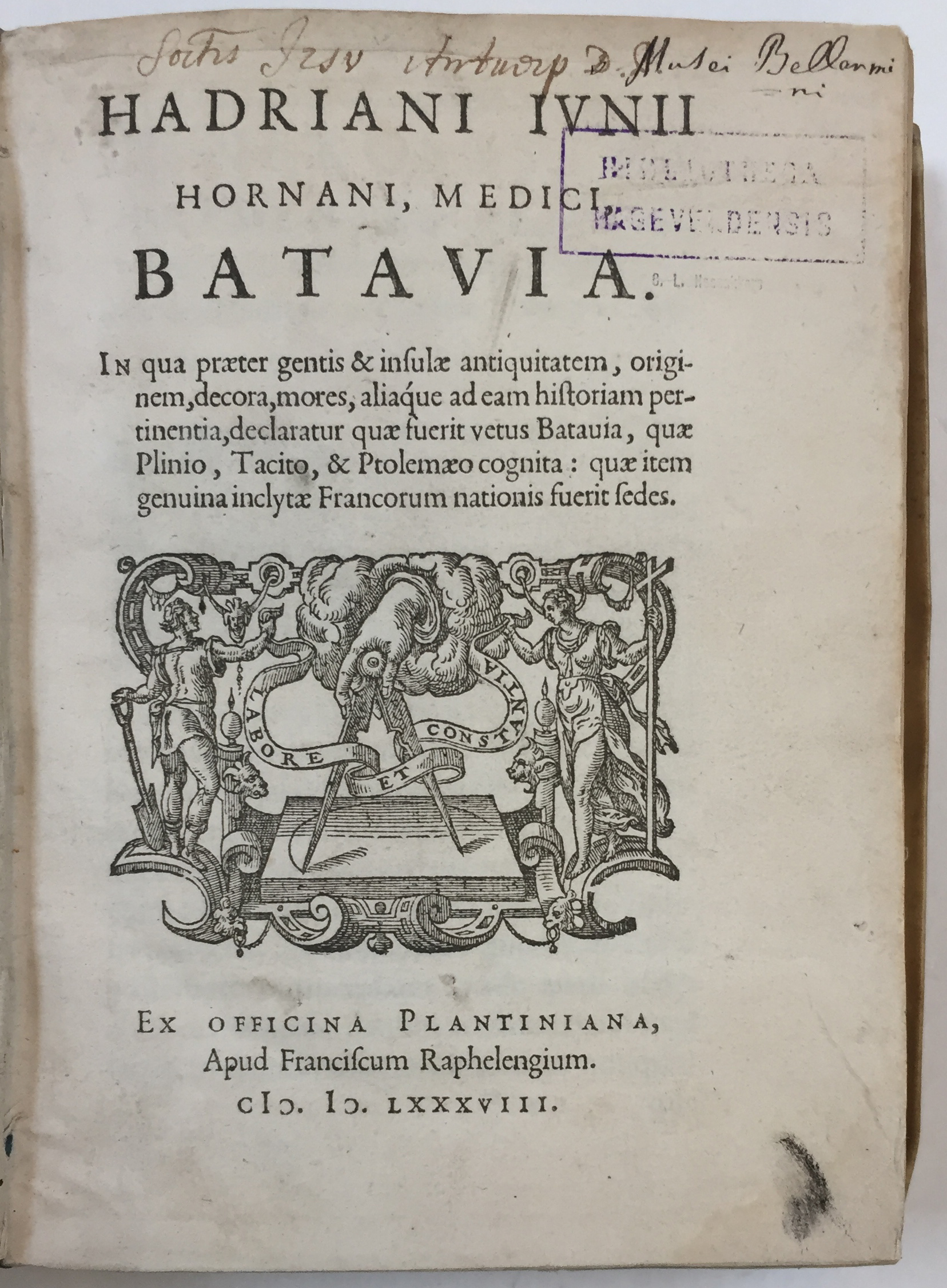 JUNIUS, H. Batavia. In qua praeter gentis et insulae antiquitatem, originem, decora, mores, aliaque ad eam historiam pertinentia declaratur quae fuerit vetus Batavia (…). Leyden, Ex Off. Plantiniana, Fr. Raphelengius, 1588. (20), 411 pp. W. woodcut printer's mark on ti. & some text-woodcuts. - Bound with: J. DOUSA, (Jr.). Bataviae Hollandiaeq. annales. Concepti atque inchoati iam olim; nunc verò a Patre eidem (...) suppleti, novaque octo librorum accessione ad integrae usque Decadis finem perducti & continuati. Leyden, Ex Off. Plantiniana, C. Raphelengius, 1601. (36), 501, (11) pp. W. small woodcut printer's mark. - 2 in 1 vol. 4°. Cont. vellum w. overl. sides. (Ties fail, ex libr. copy w. stamp on first ti., name entries on ti., first free endpaper gone, lower outer corner stained throughout).