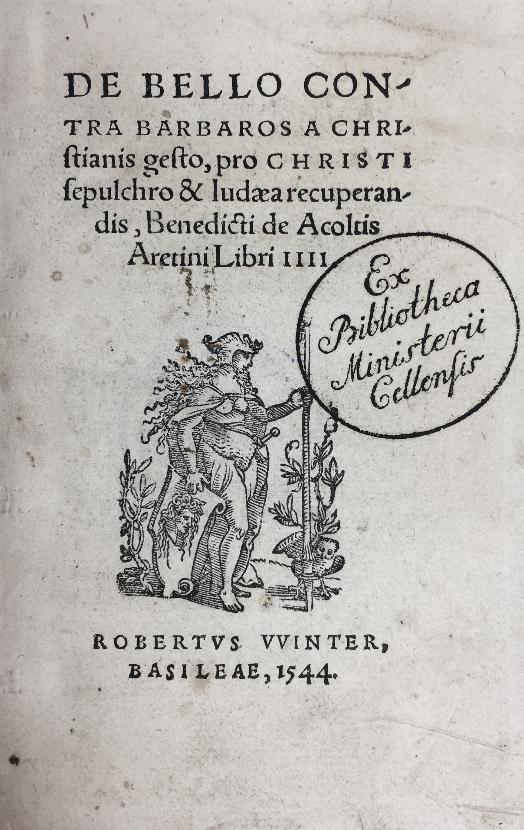 ACCOLTI, B. de. De bello contra barbaros a Christianis gestos, pro Christi sepulchro & Iudaea recuperandis libri IV. Basel, R. Winter, 1544. (136) lvs. W. 2 woodcut printer's marks. Cont. richly blindtooled pigskin w. raised bands over wooden brds. w. 2 brass clasps & catches, red edges. (Top of spine slightly worn, corners somewhat bumped, stamp on ti. (r° & v°), a few old annot., last lvs. faintly stained, else a fine and clean copy).