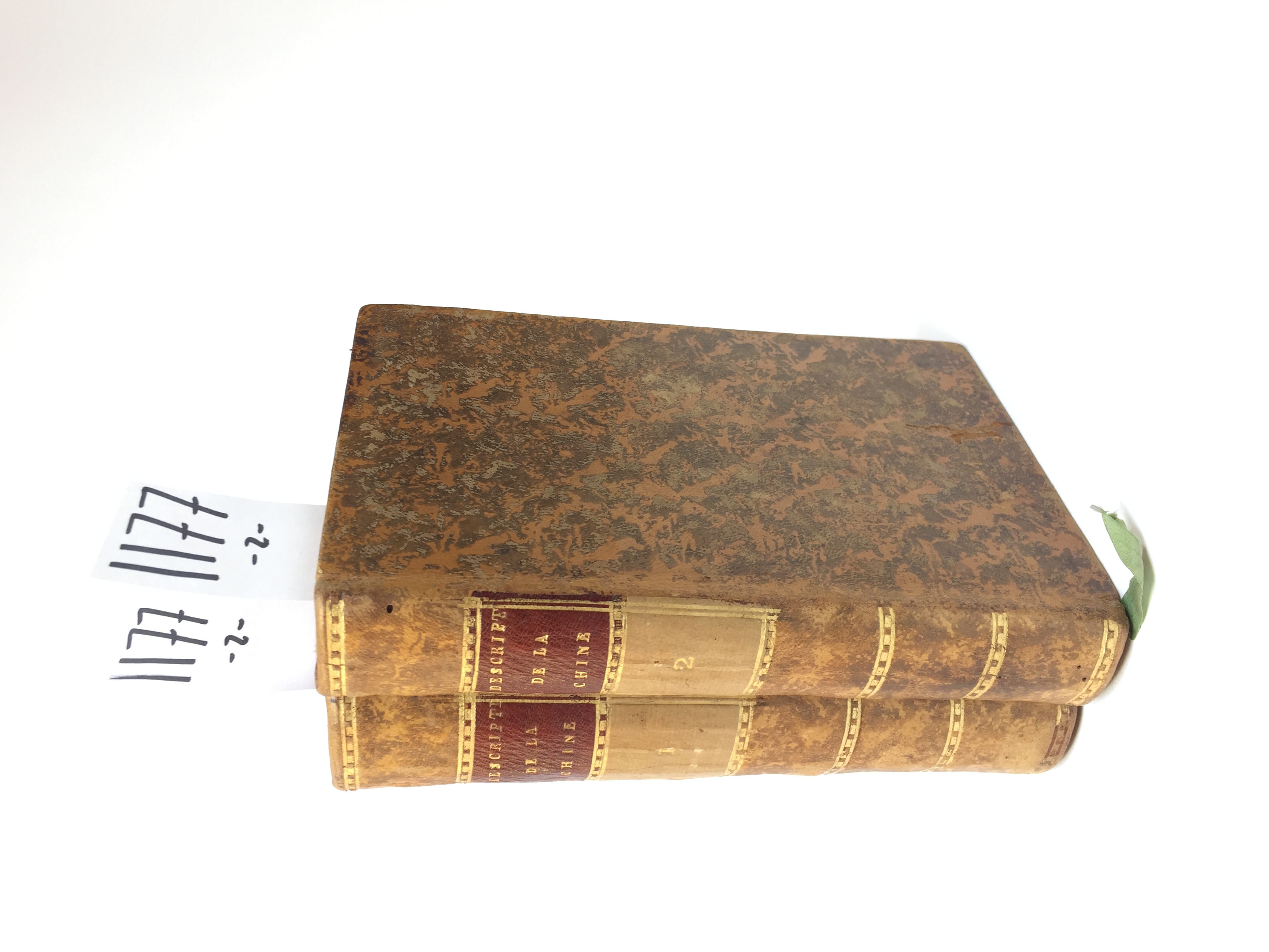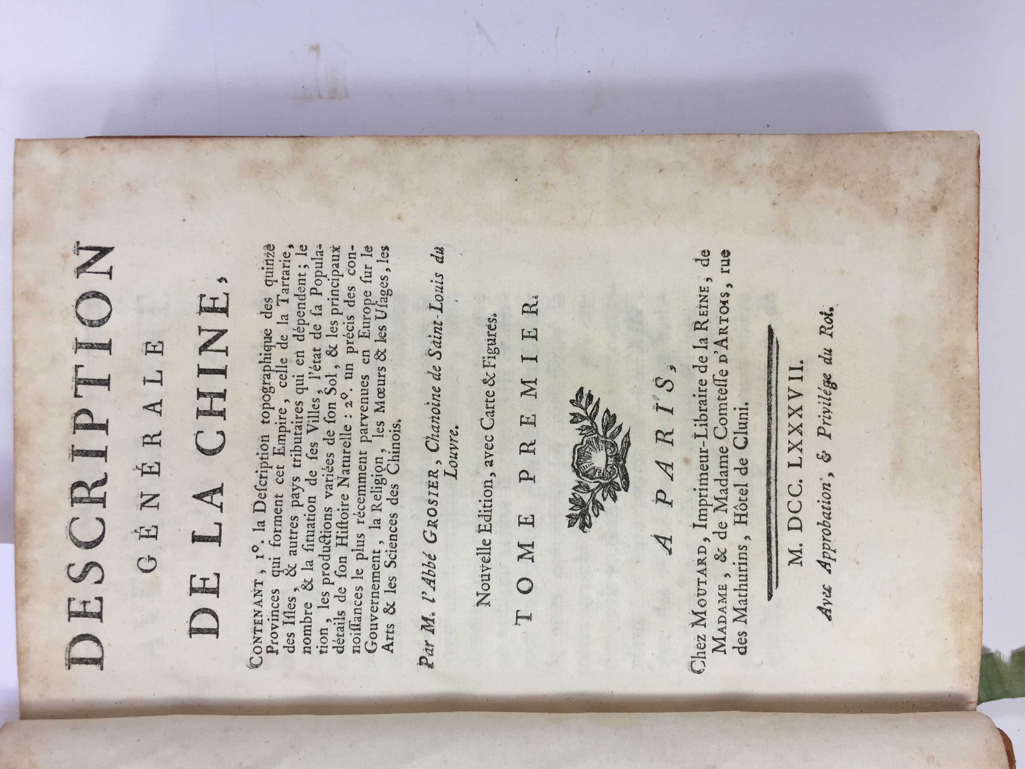 CHINA -- GROSIER, (J.B.). Description générale de la Chine, contenant 1°. La description topographique des quinze Provinces qui forment cet Empire, celle de la Tartarie, des Isles, (…). 2°. un précis des connoissances le plus récemment parvenues en Europe sur le Gouvernement, la Religion, les Moeurs & les Usages, les Arts & les Sciences des Chinois. Paris, Moutard, 1787. 2 vols. xxiv, 647; (4), 512 pp. W. lge engr. fold. map & 15 engr. on 7 fold. plates. Cont. mottled cf. w. dec. gilt backs, red and brown labels & all edges gilt.