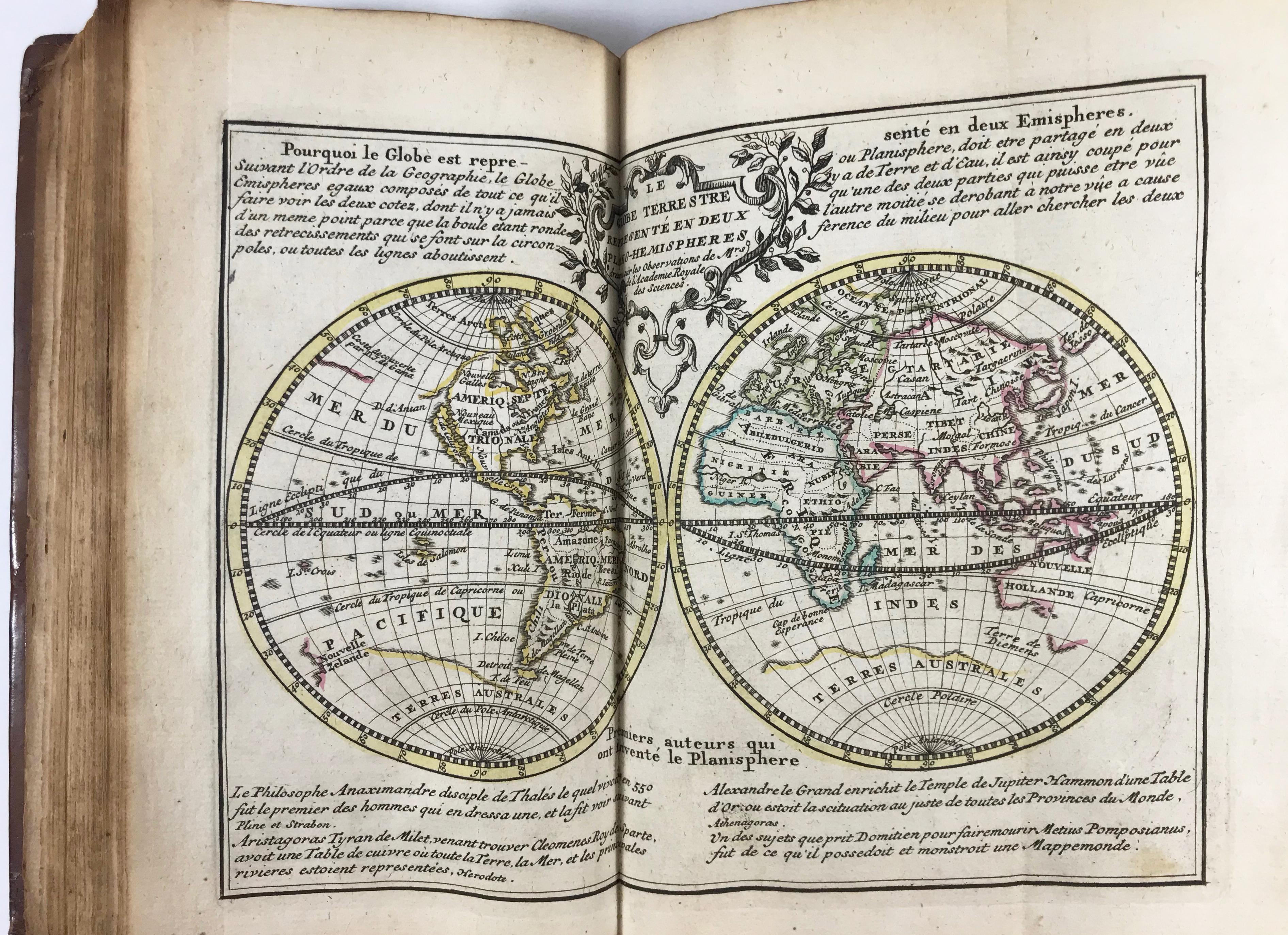 BAALDE -- NOUVEL ATLAS geographique et historique / Nieuwe geographische en historische atlas, tot de gemakkelyke oefeninge der Geographie, (...). Zamengest. d. (P.) Rousset, (...). Amst., H. de Leth/S.J. Baalde, (1770). (4), (148), (40) pp. W. engr. fold. ti., 34 maps (incl. worldmap) cold. in outlines, 2 cold. distance tables, 4 plain plates dep. terrestrial & celestial globes, and 1 plate dep. flags, all fold. Cont. cf. w. raised bands, dec. gilt back & brown label. (Joints (partly) split, spine a bit rubbed, upper margin a bit stained in places, slightly browned).