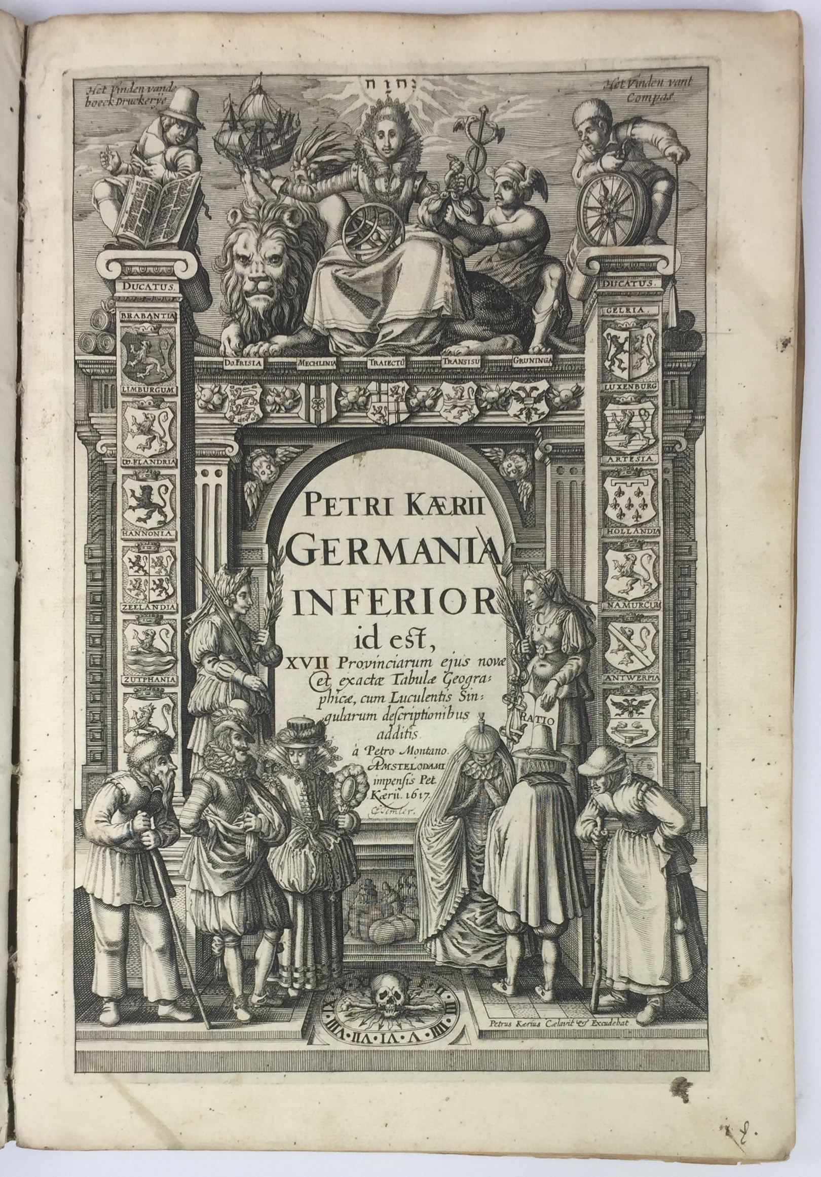 KAERIUS, P. (PIETER VAN DEN KEERE). Germania Inferior, id est, XVII Provinciarum ejus novæ et exactæ Tabulæ Geographicæ, cum Luculentis Singularum descriptionibus additis à P. Montano. Amst., P. Kaerius, 1617. (2), 94, (6) pp. W. engr. ti.-p. and 25 plain double-p. maps in text (of which 1 is actually a sequence of 5 historical scenes w. captions in Latin underneath and 1 small map, printed on 2 oblong copper plates). Fol. Cont. limp vellum w. overl. sides. (Ties fail, some age-toning/browning and unobtrusive traces of use throughout, map 'Geldria & Transysulana' printed upside down, last blank has some staining, but a superb and complete copy).