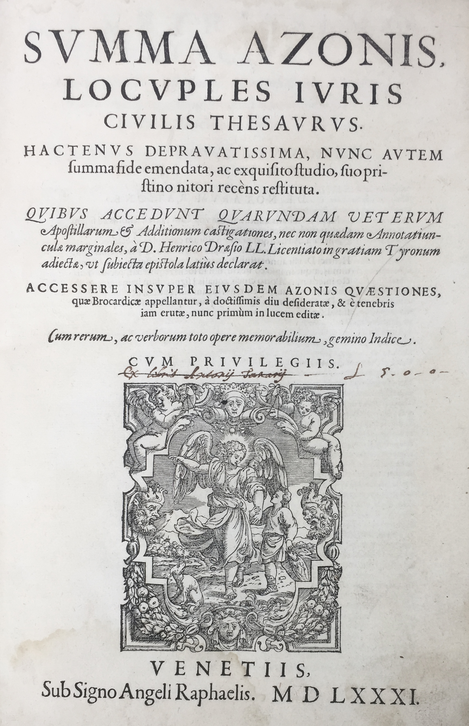 AZO, P. Summa Azonis, locuples iuris civilis thesaurus. (…) Quibus accedunt quarundam veterum apostillarum & additionum castigationes nec non quaedam annotatiunculae marginales à D. Henrico Draesio (…). Accessere insuper eiusdem Azonis quaestiones quae Brocardicae appellantur (…). Venice, Sub Signo Angeli Raphaelis, 1581. 2 parts in 1 vol. (80) pp., 1288 cols., (16) pp., 170 cols. W. 2 woodcut printer's marks on ti-pp. Fol. Cont. blind tooled pigskin over wooden brds. w. brass clasps and catches. (Extremities slightly worn/dam., 1 clasp partly broken, new endpapers, name entry on ti., margins (faintly) stained in places, a bit browned in places).