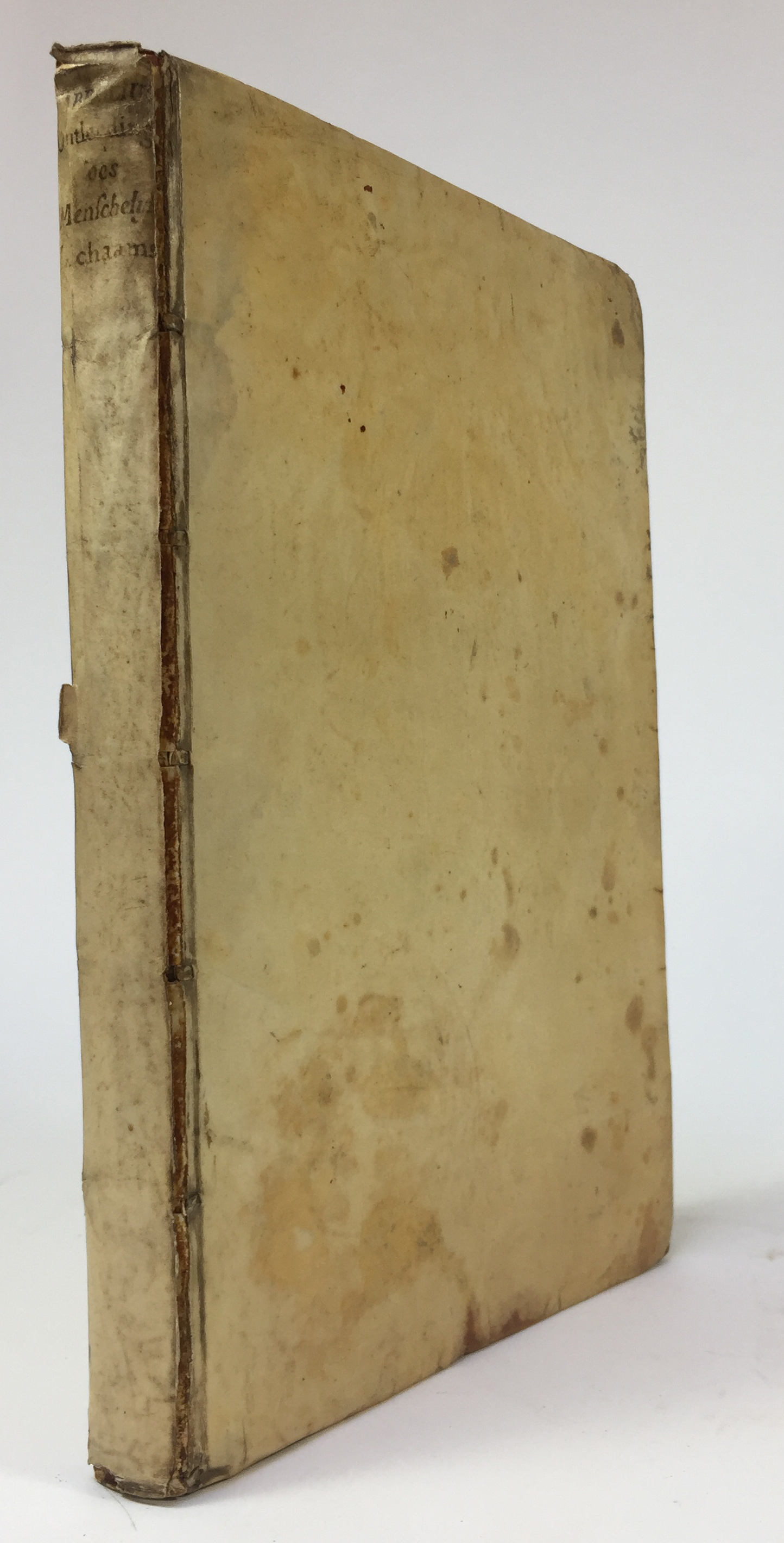 CABROLIUS, B. Ontleeding des Menschelycken Lichaems. Eertyts int Latijn beschreven, nu verduijtscht en met bijvoechselen als oock Figueren verrijckt d. V.F. P(lemp). Amst., C. v. Breugel for H. Laurents, 1633. (16), 262 pp. W. 4 double-p. plates & 123 text-engr. of human parts (i.a. many skulls), diff. in size. Fol. Cont. vellum. (Upper hinge split and clumsily rep., traces of use (i.e. a bit thumbed, small stains in places), small repair to lf. 1N5, small wormhole in lower inner margin of lvs. 1H3-1I6 (not affecting text), last blank failing).