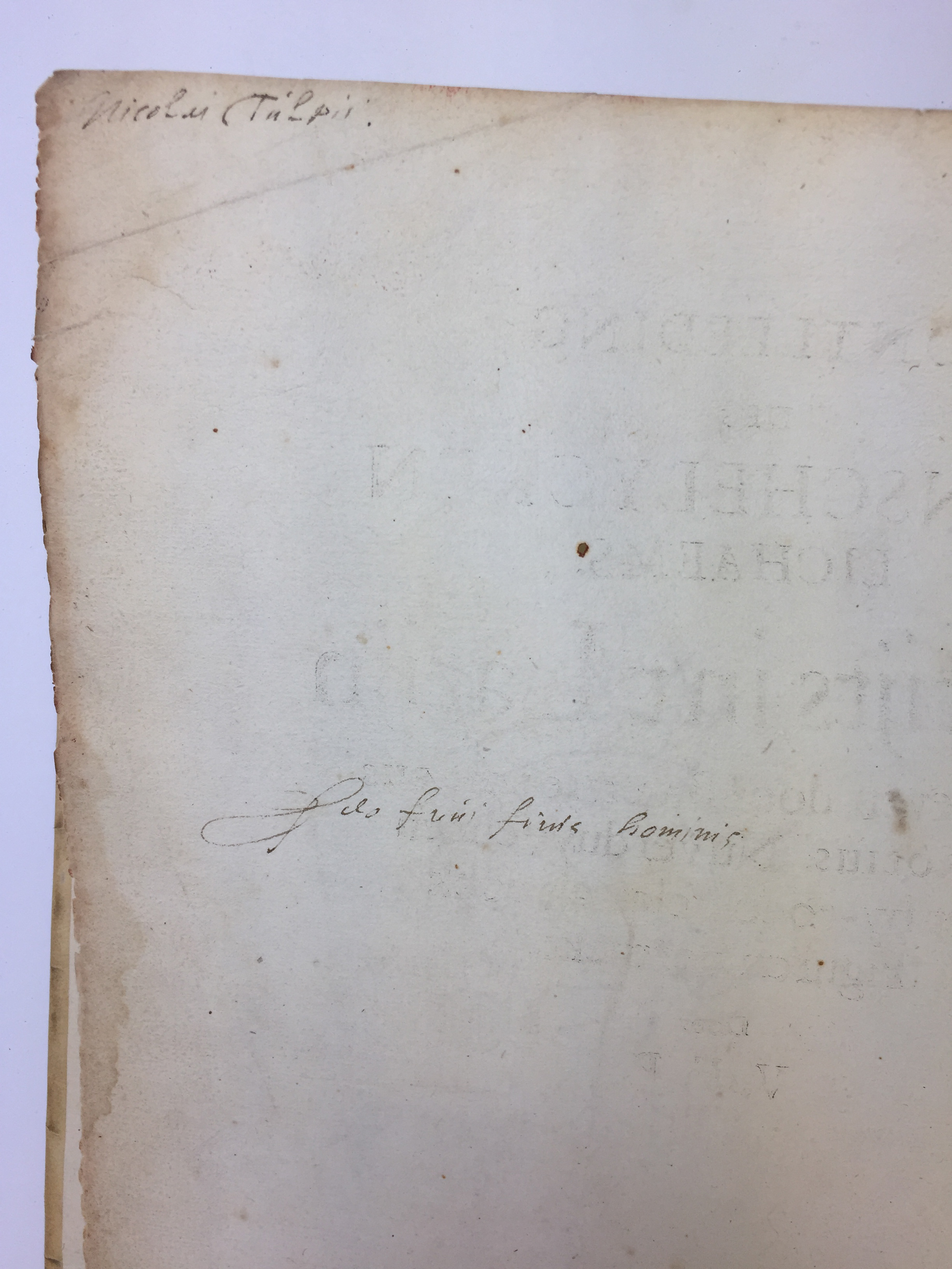 Nicolaes Tulp's own copy, with his name written on the upper outer corner of the first free endpaper (v°-side). Some 10 cm below his name in the same hand, follows Tulp's motto "Deo frui finis hominis" ("To enjoy the end of man"). This first Dutch edition was also dedicated to Tulp (1593-1674) by the translator Vopiscus Fortunatus Plemp (1601-c.1671) with a 'Toe-eyghen-brief' which follows after the fine engraved title. Nicolaes Tulp was one of the most famous medical doctors of the 17th c., but he will eternally be remembered because of his portrait by Rembrandt: the 'Anatomy Lesson of Dr. Nicolaes Tulp' (1632). Curiously enough, this edition also has an engraved double-page representation after Jacob de Gheyn II by Andries Jacobsz Stock of an anatomical lesson given by Pieter Pauw at the Leiden anatomical theatre. - Lindeboom 1544-5; Hirsch IV, 630; cf. Cat. Haskell F. Norman Library, 422.€ 3000