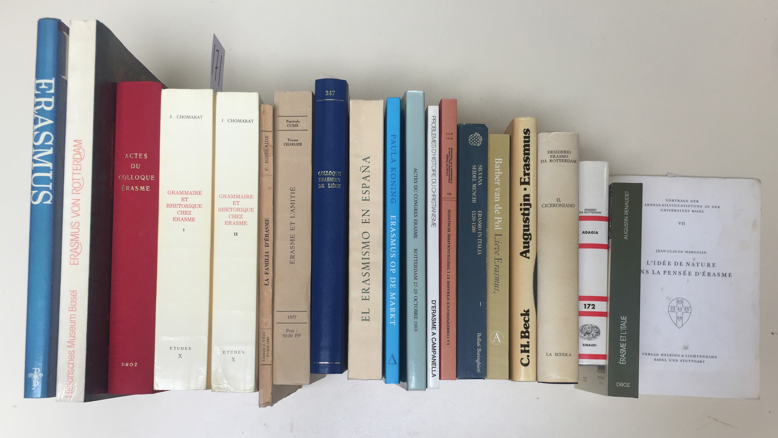 ERASMUS -- CHOMARAT, J. Grammaire et rhetorique chez Erasme. 1981. 2 vols. Lge-8°. Owrps. -- Id., (e.a.). Actes du colloque international Érasme (Tours 1986). 1990. Ocl. -- D. ERASMUS. Il Ciceroniano o dello stile migliore. A cura di A. Gambaro. (1965). Ocl. w. dust-j. -- J.M. MASSAUT, ed. Colloque Érasmien de Liège. 1987. Or. bind. -- M.R. SAÑUDO & C.M. ARROYO. El Erasmismo en Espanã. 1986. Owrps. -- And 14 o. on/by E. (20).