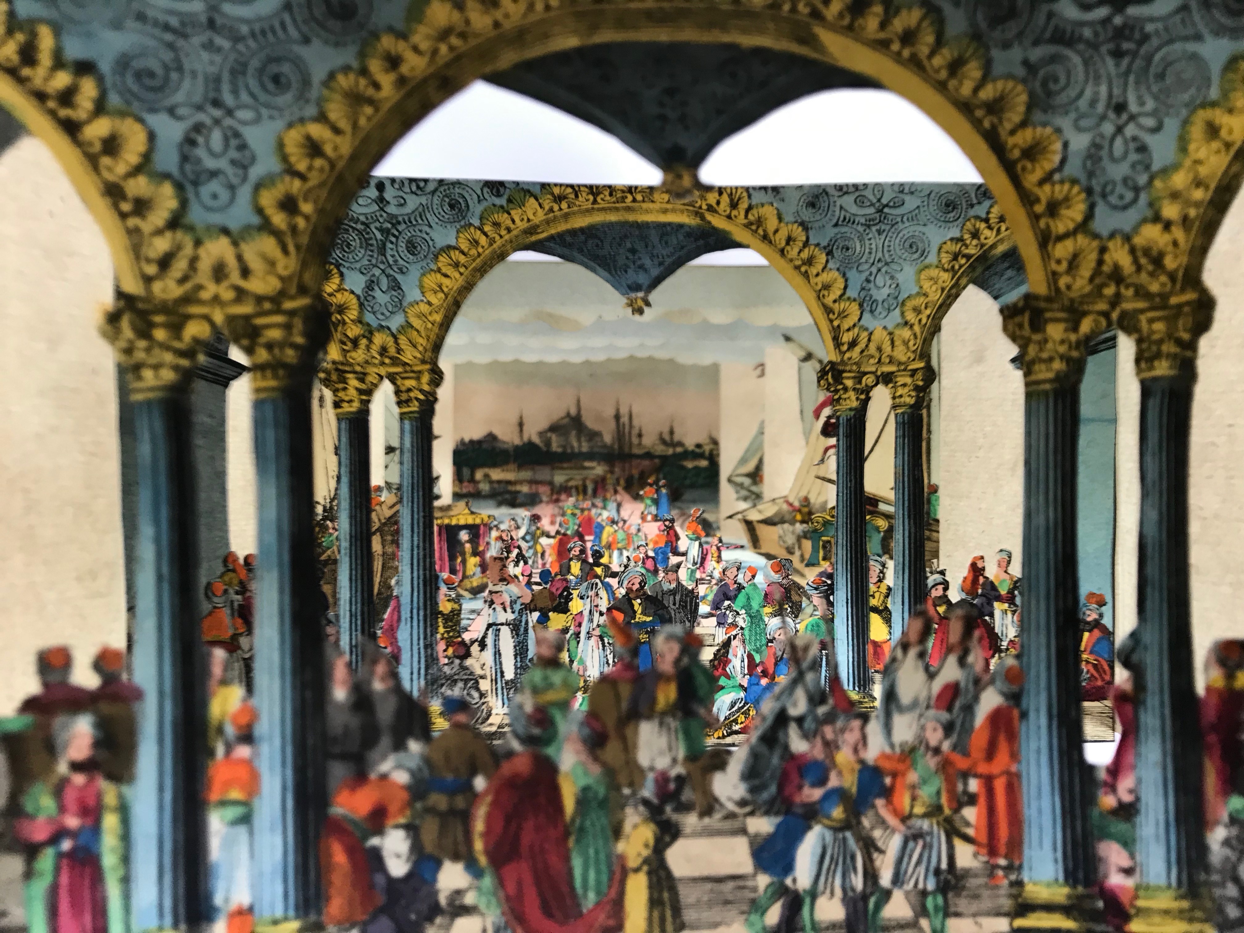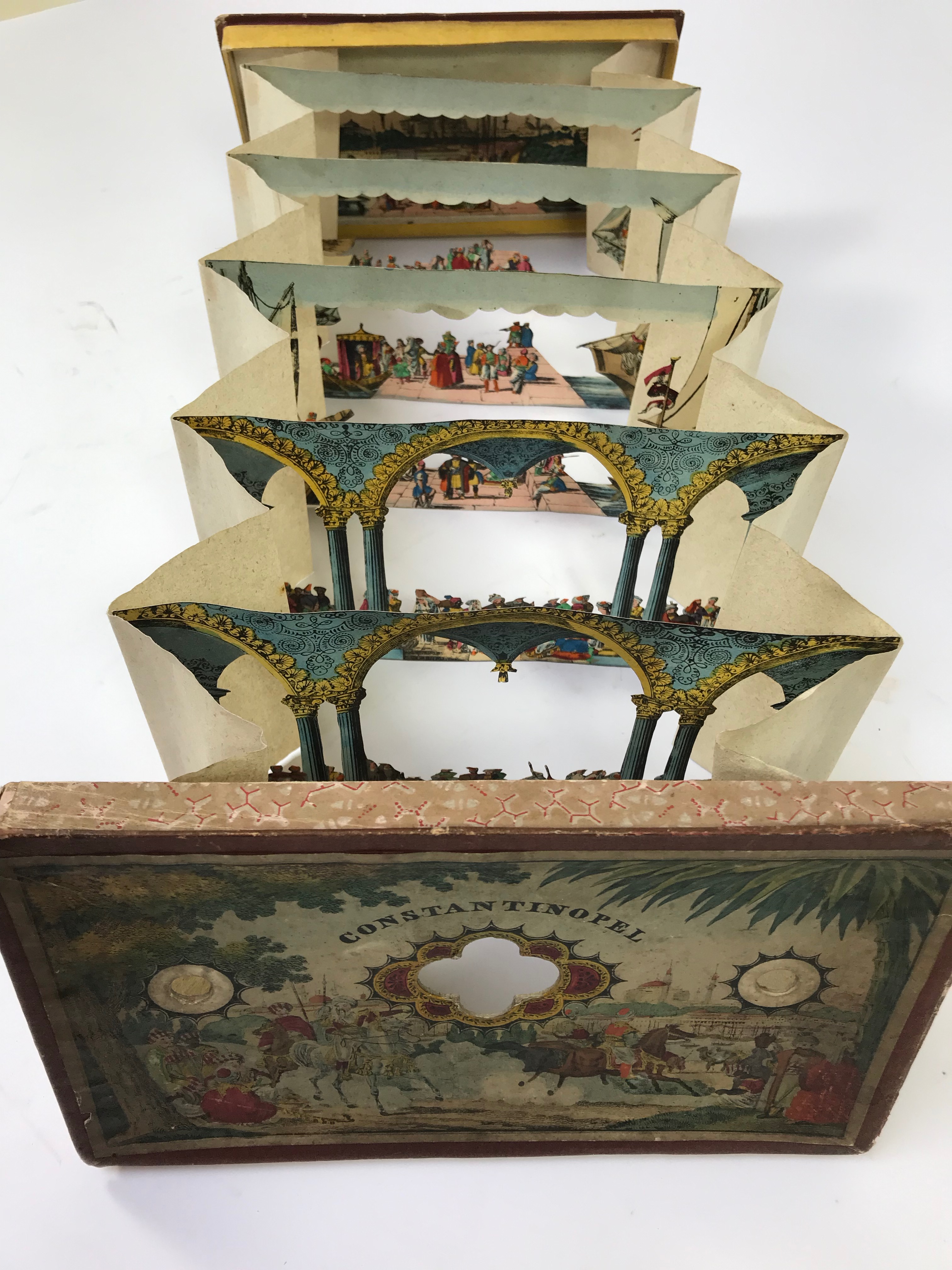 PEEPSHOW -- CONSTANTINOPEL. N.d. (c. 1835?). Accordion-folding peepshow representing a profile view of Istanbul with the Hagia Sophia in the centre consisting of 5 cold. lithogr. cut-out panels, expanding by paper bellows. The front-face, measuring 135 x 225 mm, forms the lid of the shallow cartonnage box containing the peepshow.