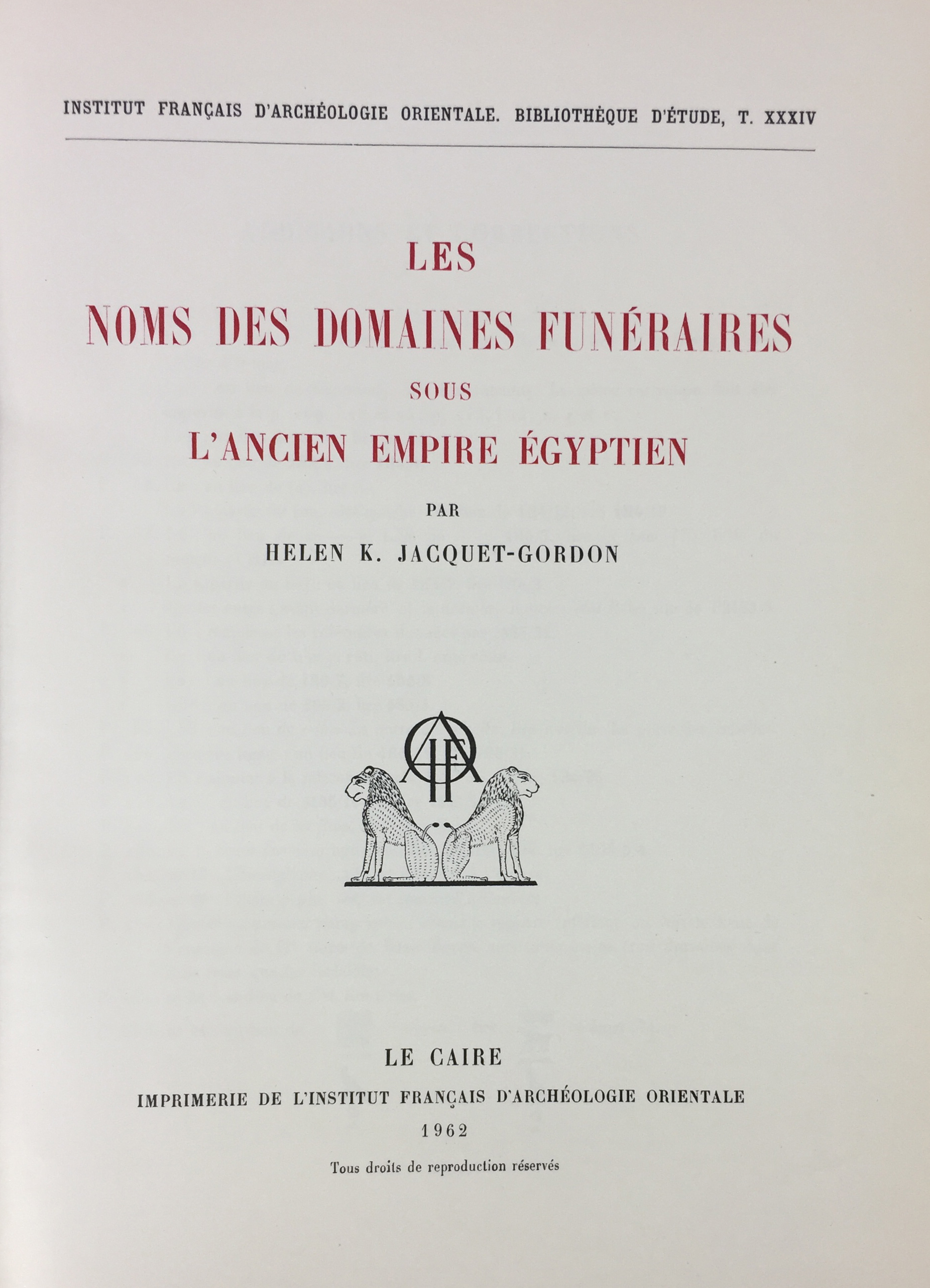 JACQUET-GORDON, H.K. Les noms des domaines funéraires sous l'ancien empire égyptien. Cairo, 1962. xiv, 505 pp. 4°. Mod. cl. w. burgundy label. (IFAO, Bibl. d'Étude, 34). - Scarce.