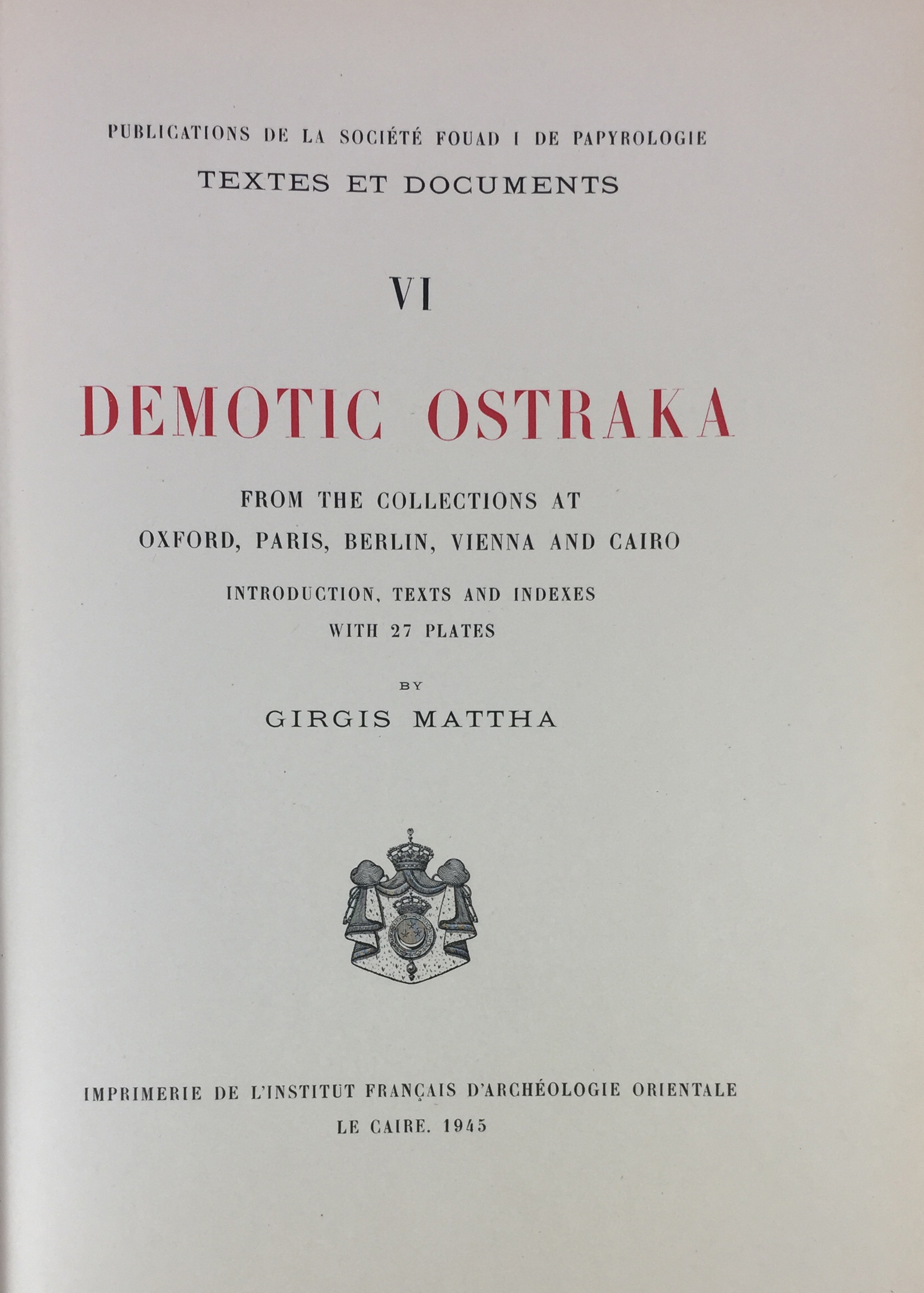 MATTHA, G. Demotic ostraka from the collections at Oxford, Paris, Berlin, Vienna and Cairo. Introd., texts and indexes. Cairo, 1945. xviii, 262, (2) pp. W. 27 plates. Fol. Beautiful cont. h. mor. w. raised bands & gilt lettering, w. owrps. bound up. (Publ. de la Soc. Fouad I de Papyrologie, Textes et Documents VI).