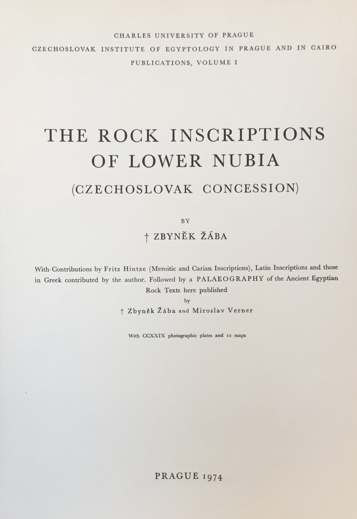 SMITH, H.S. The Fortress of Buhen: The inscriptions. 1976. W. 84 plates. 4°. Ocl. w. dust-j. -- Z. ZÁBA. The rock inscriptions of lower Nubia (Czechoslovak concession). 1974. Prof. ill. Fol. Ocl. w. (worn) dust-j. -- A.I. SADEK. The amethyst mining inscriptions of Wadi el-Hudi. (1980-85). 2 vols. 4°. Owrps. -- And 2 o. (6).