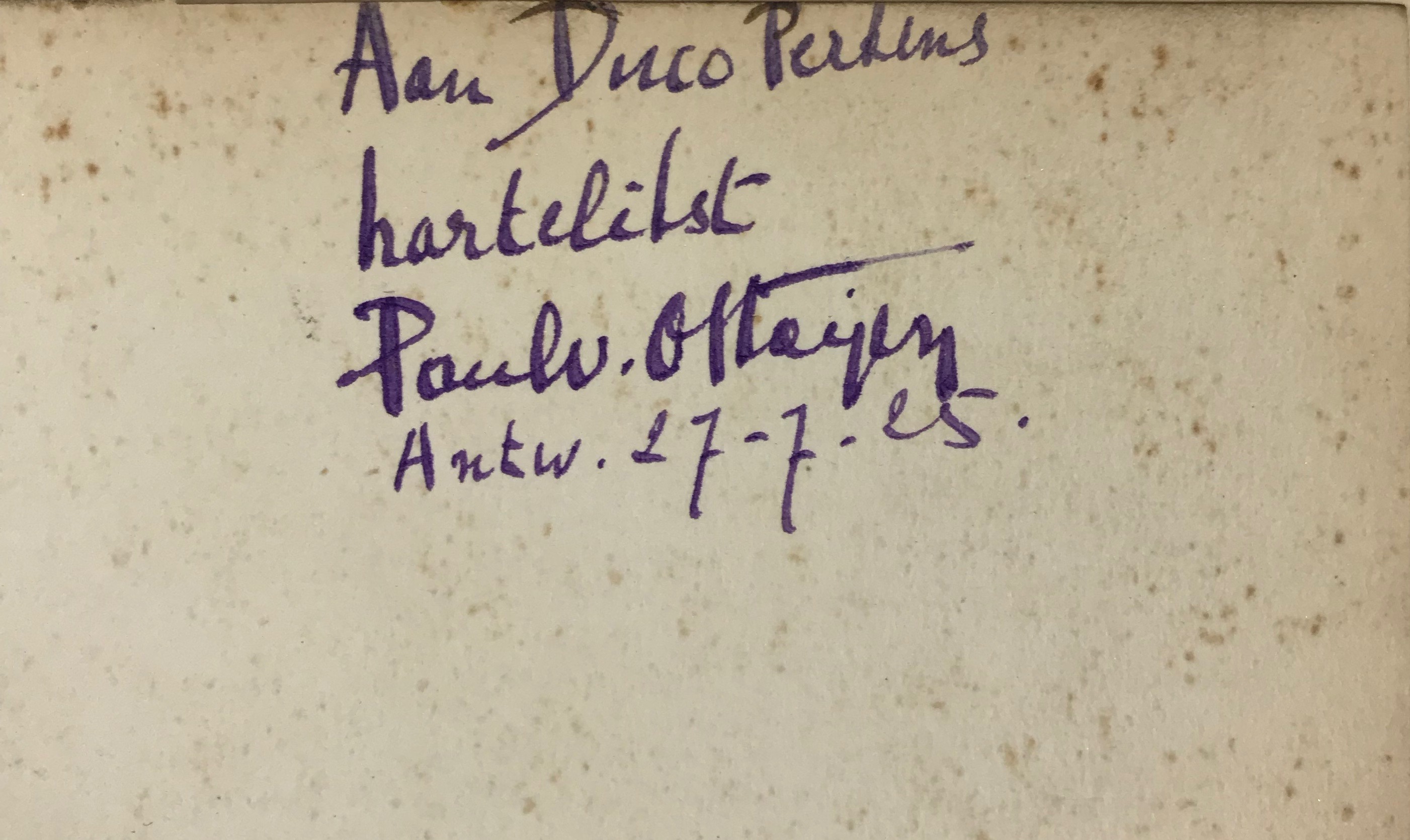 First edition, printed in 330 numb. copies. Our copy nr. 8 of 30 "auteurs-exemplaren gedrukt op Engels tekenpapier (...) niet in de handel". - With author's autograph dedictation: "Aan Duco Perkens [= E. du Perron]/ hartelikst/ Paul v. Ostaijen/ Antw. 27-7-25." And with pencil annot. by Du Perron on first free endpaper: "2e Cahier v/d Driehoek verschenen tusschen Claudia en Een tussen Vijf". The binding is typical for books from the library of Du perron.€ 1500
