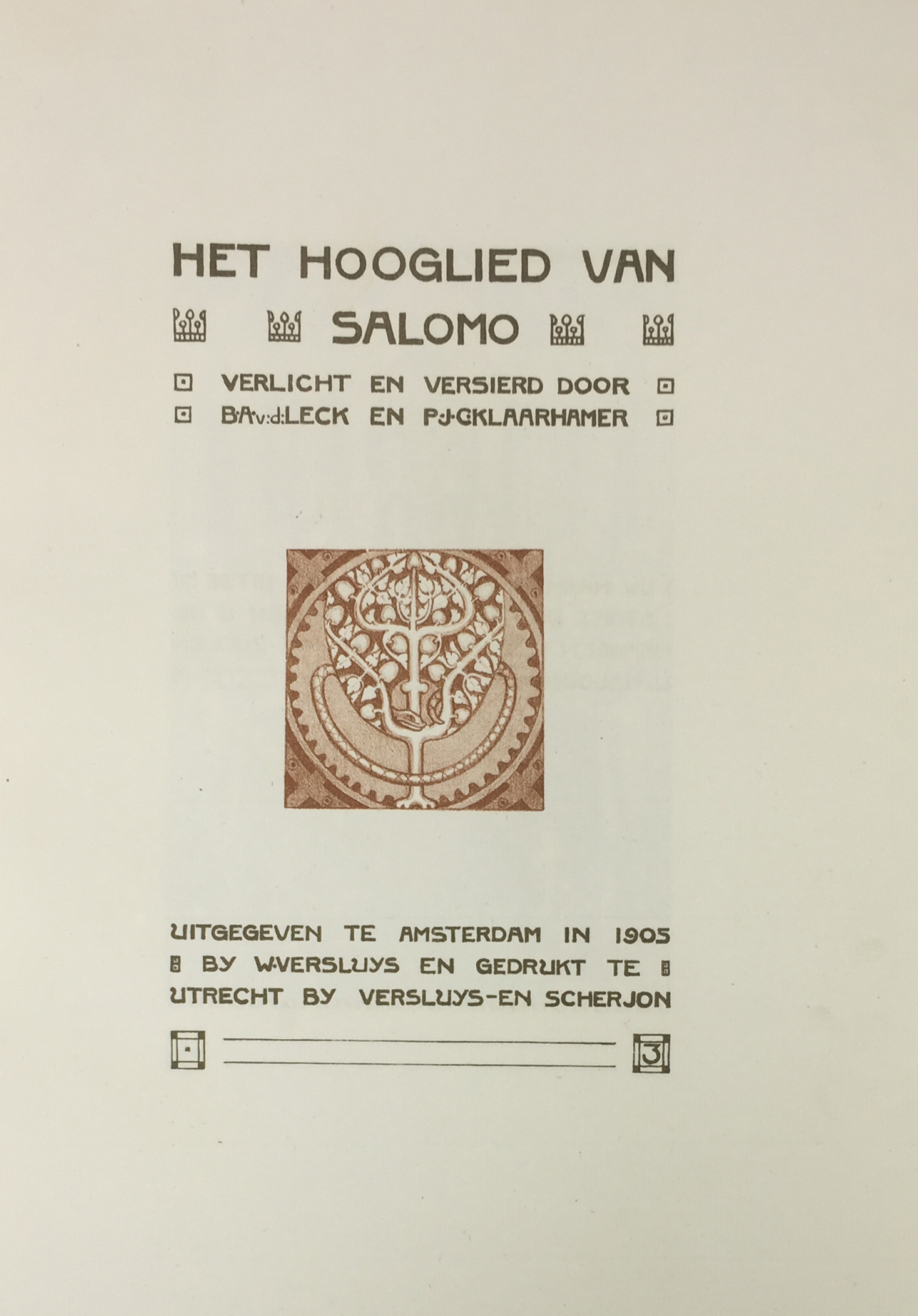 LECK -- HOOGLIED van Salomo, Het. Verlicht & versierd d. B.A. v.d. Leck & P.J. Klaarhamer. Amst., Versluys, 1905. W. 21 lithogr. by B.A. v.d. Leck & 16 head- & tail-pieces. Fol. Or. dec. hcl., dec. front side. (Cloth shows some foxing, else a very good copy).